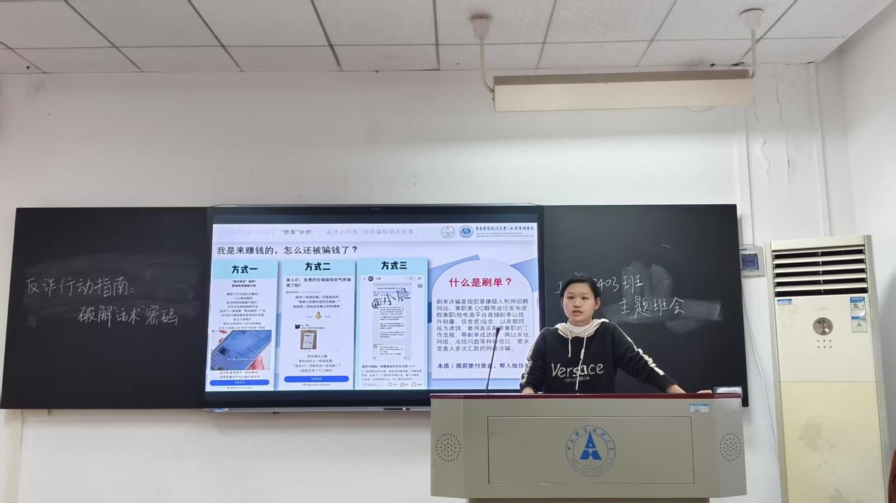在这一部分,活动详细揭秘了诈骗分子的常用手段。如网络购物诈骗,骗子会以商品质量问题、订单异常等理由,诱导同学们点击虚假链接进行退款操作,从而骗取钱财;电信诈骗则常常冒充公检法机关,以涉嫌违法犯罪为由,要求同学们将资金转到所谓的“安全账户”。还有交友诈骗,骗子通过社交平台与同学们建立联系,获取信任后编造各种理由索要钱财。而本环节主持人程锦煜同学也开展了防诈骗问答环节,同学们都热情洋溢,积极参与。