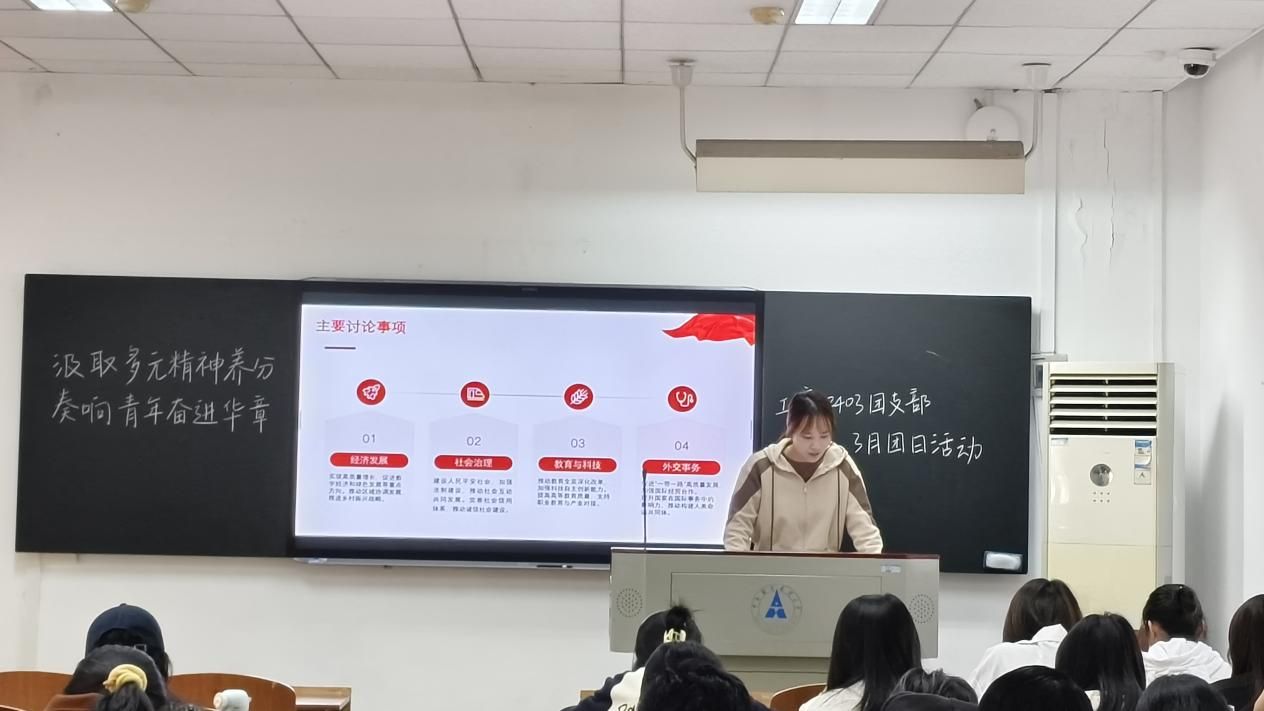 紧接着,李春同学围绕“学习‘两会精神’激扬青春力量”展开分享,她的讲解深入浅出,让同学们深刻领会了“两会”精神的内涵,并激励大家将其融入到日常学习和生活中,以积极的态度面对学习中的困难,在青春的赛道上奋力奔跑,为国家发展贡献自己的青春力量!