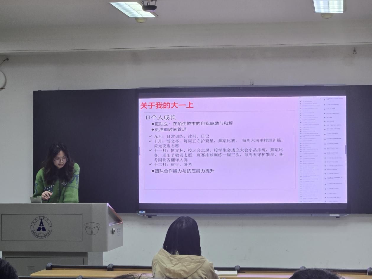 最后,辅导员潘俊颐对本次班会进行总结点评。她对同学们的分享给予了高度评价,一方面肯定各位同学在适应大学生活上的快速进步,另一方面对于各位同学的本学期规划十分欣慰。同时,潘俊颐建议在讲演时注重与观众的眼神交流,并希望各位同学加强PPT技巧学习。此外,她表示,大家要争做勤学善思的求知者、修善笃行的担当者、知行合一的奋进者,在学习中增长才干,在实践中锤炼本领,努力成长为社会主义事业合格建设者和可靠接班人。潘俊颐向同学们再次强调防诈反诈,提醒大家时刻保持警惕,不要主动“打开钱包”,守护好自己的人身和财产安全。