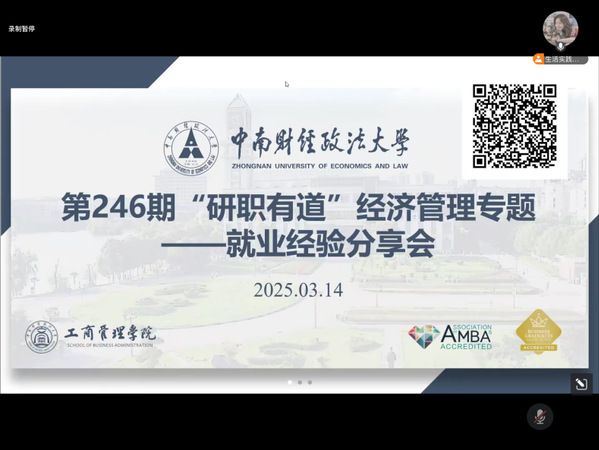 (通讯员:付珺祎)为帮助学院同学适应复杂多变的就业环境,树立合理清晰的就业观念,2025年3月14日晚19:30工商管理学院第246期“研职有道”经济管理专题——就业经验分享会活动以线上腾讯会议的形式顺利进行。本次活动邀请2020级营销管理专业李益智和汪家玲同学分享就业经验,由院研会生活实践中心毕良莹主持,学院各年级研究生同学踊跃参加。