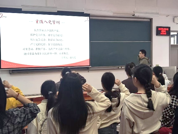第二环节,由支部书记南天亮老师带领,全体支部委员紧握右拳,面对党旗重温入党誓词,以铮铮誓言回溯初心,更加坚定理想信念。