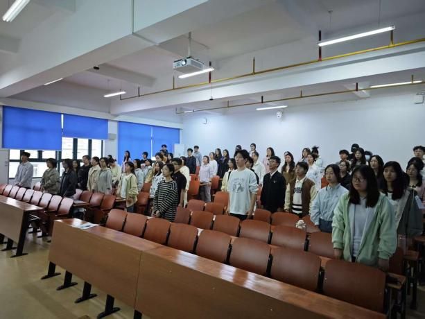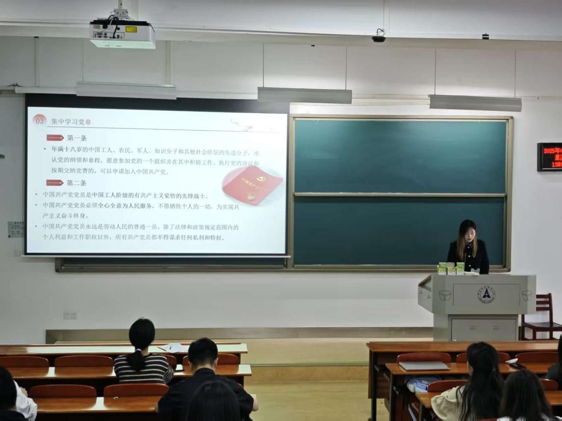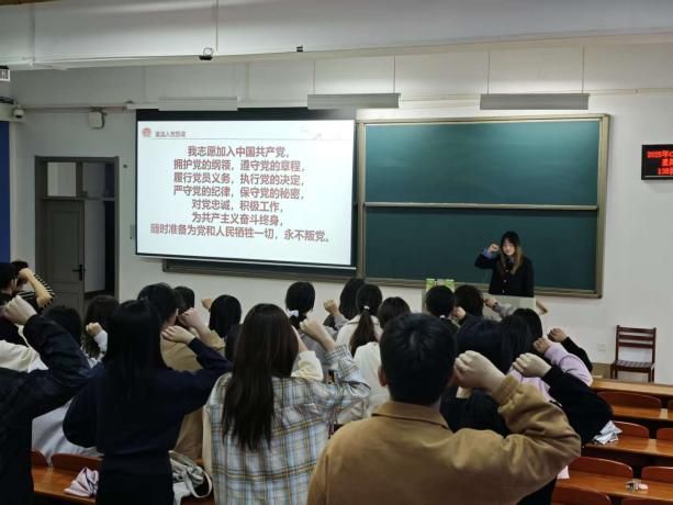 大会第二项,全体成员齐唱国歌,随后支部副书记钱莹飞同学带领大家重温入党誓词,并领学《中国共产党章程》,带领大家集中学习了前三条内容,强调了党员标准以及党员必须履行的义务。