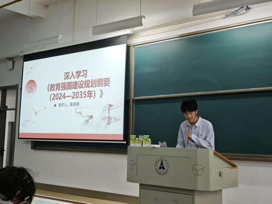 之后,陈鸿填同学带领大家深入学习《教育强国建设规划纲要(2024—2035年)》,为大家讲解了教育强国的主要目标,鼓励大家坚持以习近平新时代中国特色社会主义思想为指导,深入贯彻党的二十大和二十届二中、三中全会精神,全面贯彻习近平总书记关于教育的重要论述,深刻领悟“两个确立”的决定性意义,坚决做到“两个维护”。