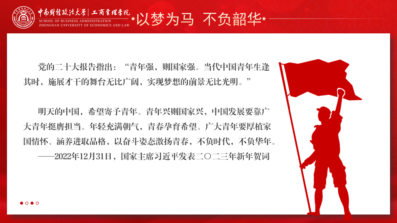 班会由两部分组成。第一部分通过引用党的二十大报告和国家主席习近平2023年新年贺词中的相关内容,强调了青年在国家发展中的重要地位。“青年强,则国家强”当代中国青年生逢其时,施展才干的舞台无比广阔,实现梦想的前景无比光明。” 这一论述为整场班会奠定了基调,激励着同学们以积极的姿态面对未来。