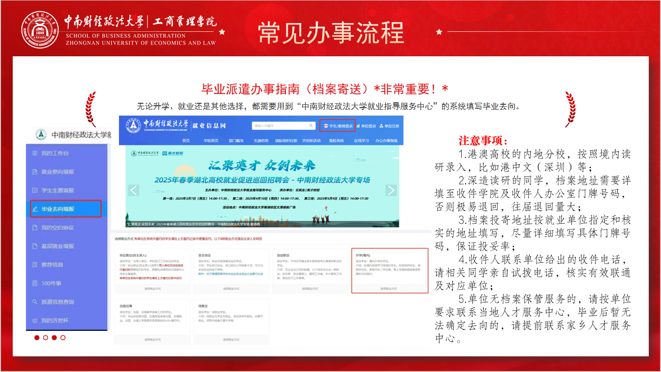 辅导员老师为毕业季的同学们提供各个时间节点与流程的建议。在本次主题班会上,关键时间节点涵盖了3 - 6月诸多重要事项,像论文答辩稿提交、西部计划报名、毕业相关手续办理等。常见办事流程包含各类盖章地点、不同证明办理方式、校园VPN使用教程,以及毕业去向填写、档案寄送等详细指南,档案处理建议回原籍并电话确认接收信息。三方协议方面,明确了其定义、作用、与劳动合同的区别、签订注意事项和违约处理办法,强调签三方协议不影响应届生身份,但签劳动合同可能丧失该身份。安全问题涉及人身、财产、交通、消防等,提醒同学们保持良好心态、防范诈骗、遵守交规、增强消防意识。未来规划上,求职就业同学要注意签约细节,加入就业联络群;升学深造同学需做好复试调剂准备、提前联系导师;留学同学要跟进申请进度、准备签证,其他选择的同学也需做好相应规划,为未来发展做好充分准备。