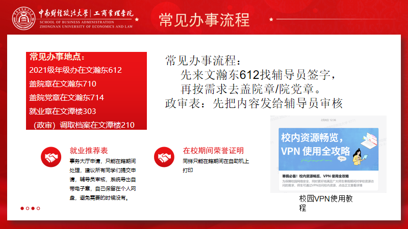 班会第二部分南天亮老师详细介绍了毕业季常见的办事地点和流程,如就业章盖章、政审表填写、就业推荐表和在校期间证明的打印等。他还强调了学会使用校园VPN的重要性,并提供了相关教程供同学们参考。此外,南天亮老师还讲解了毕业派遣的办事指南,包括档案寄送的重要性和具体操作流程。他建议同学们在无明确存放单位的情况下将档案存放在家乡的人才服务中心,并提供了查询人才服务机构的方法。