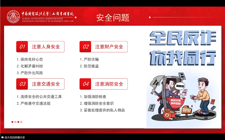 安全问题环节,班会从“人身安全、财产安全、交通安全、消防安全”四大维度展开提醒,强调保持良好心态、防范诈骗盗窃、遵守交通法规、加强消防检查等要点,结合“全民反诈”宣传,呼吁同学们提高安全防范意识,守护个人生命财产安全。