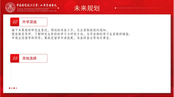 在未来规划部分,班会围绕“求职就业、升学深造、其他选择”展开指导。针对求职就业,分享了单位签约注意事项,推荐加入就业联络群获取资源;针对升学深造,提醒提前做好学习规划,加强与导师沟通;同时鼓励同学们结合自身情况,理性选择发展路径。