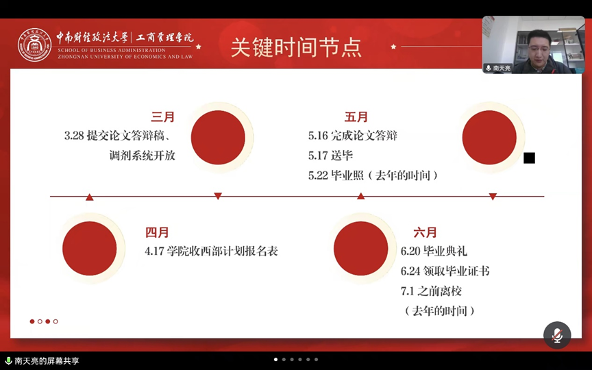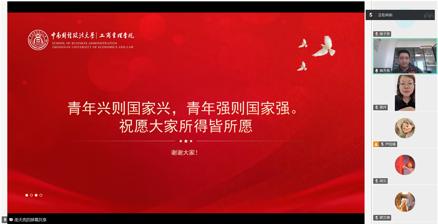 为引导青年学生明确使命担当,助力学期事务规划,2025年3月28日下午3点,工商管理学院工商2102班通过腾讯会议开展“强国建设 青年何为”线上主题班会。本次班会由班级导师栗洋老师和辅导员南天亮共同主持,围绕青年担当、毕业节点、办事流程、安全提醒、未来规划等内容展开讲解。