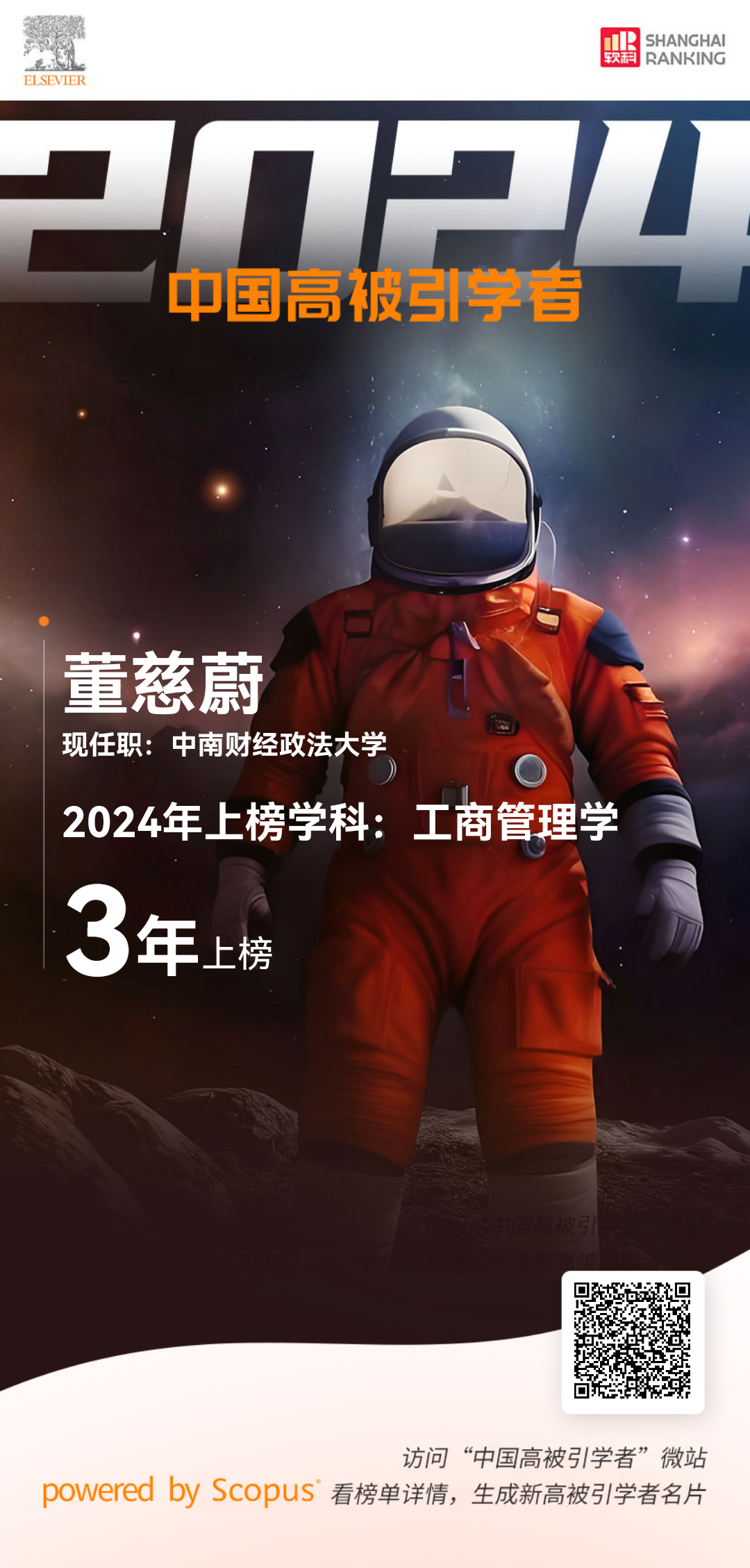| 2025年3月25日,知名学术出版巨头爱思唯尔(Elsevier) 公布了备受瞩目的2024年度“中国高被引学者” (Highly Cited Chinese Researchers) 榜单。该榜单基于全球权威引文索引数据库 Scopus,对中国学者的科研成果进行统计和分析。我院董慈蔚教授再次入选工商管理学科“中国高被引学者”,这充分彰显了学院在一流学科建设中的持续学术积累和学科优势的不断扩大,同时也进一步提升了我校在国际学术界的影响力,为一流学科建设注入了新的动力。 |