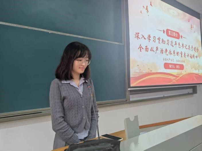 活动伊始,陆宇涵同学带领全体支部成员奏唱国歌、重温入党誓词并集中学习《中国共产党章程》中的总纲。用党的性质、行动指南和指导思想润物细无声地洗涤支部成员的思想,加深了对党的基本认识。