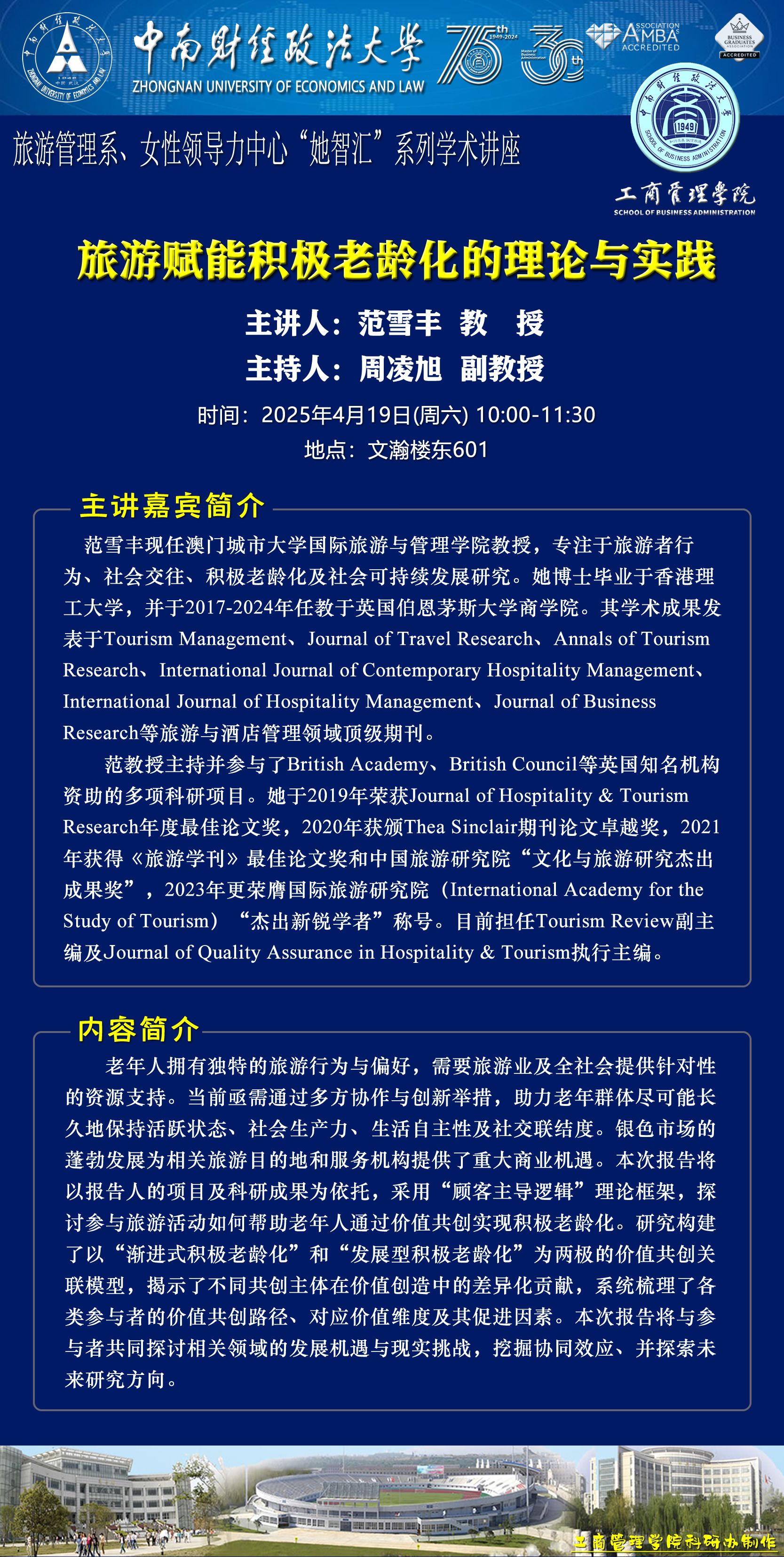 时间地点主办单位主持人主讲人主题2025.04.16 9:30文瀚楼东601营销管理系费显政 教授苏磊 副教授Pronounced as Prestigious: How Stress Patterns in Brand Name Pronunciations Influence Perceived Luxuriousness2025.04.19 10:00-11:30文瀚楼东601旅游管理系女性领导力中心周凌旭 副教授范雪丰 教授旅游赋能积极老龄化的理论与实践