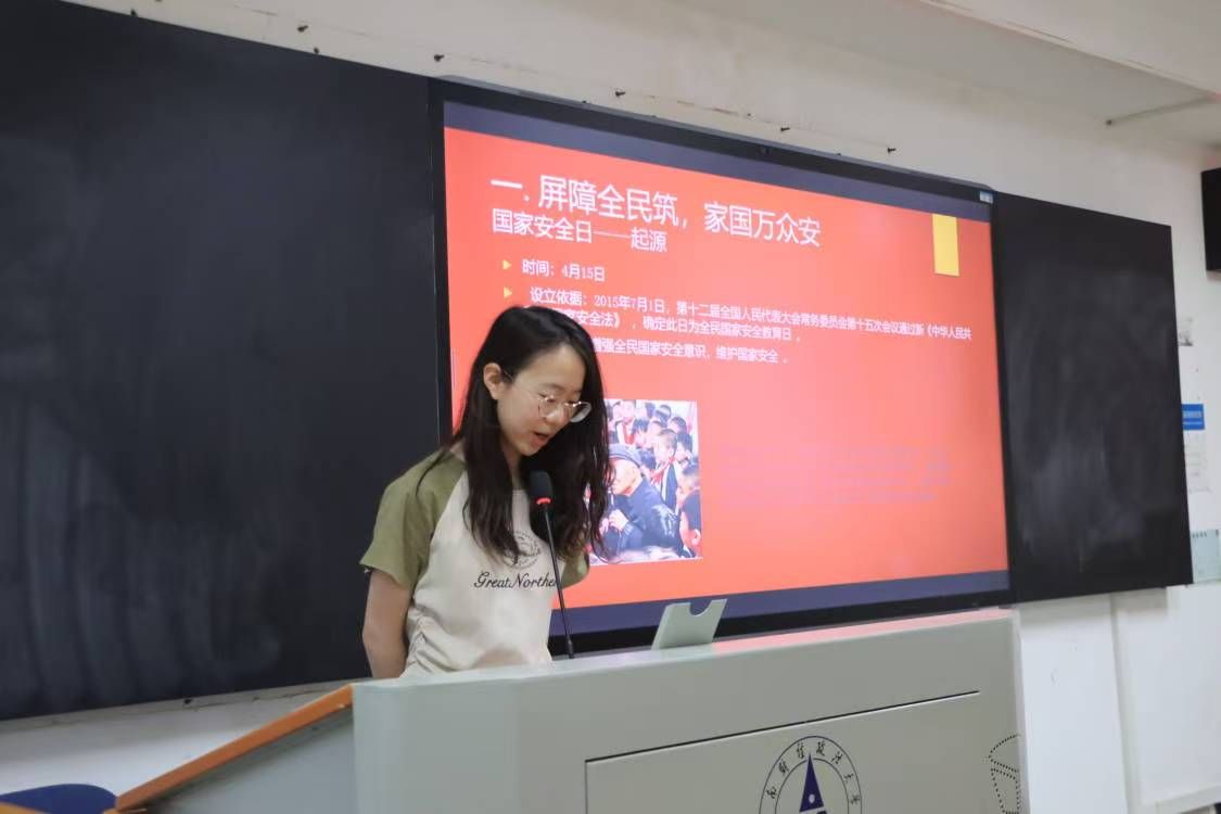 活动开始,大家在团支书郭志鹏的带领下齐唱中国共青团团歌,随后由班长程小珊展示第一部分“屏障全民筑,家国万众安”内容,向大家介绍国家安全日的起源和意义,让同学们更全面地理解国家安全的深刻内涵,进一步加强大家的国家安全意识,提高警惕性,提高国家安全素养,进而凝聚力量,齐心协力,筑牢国家安全防线。