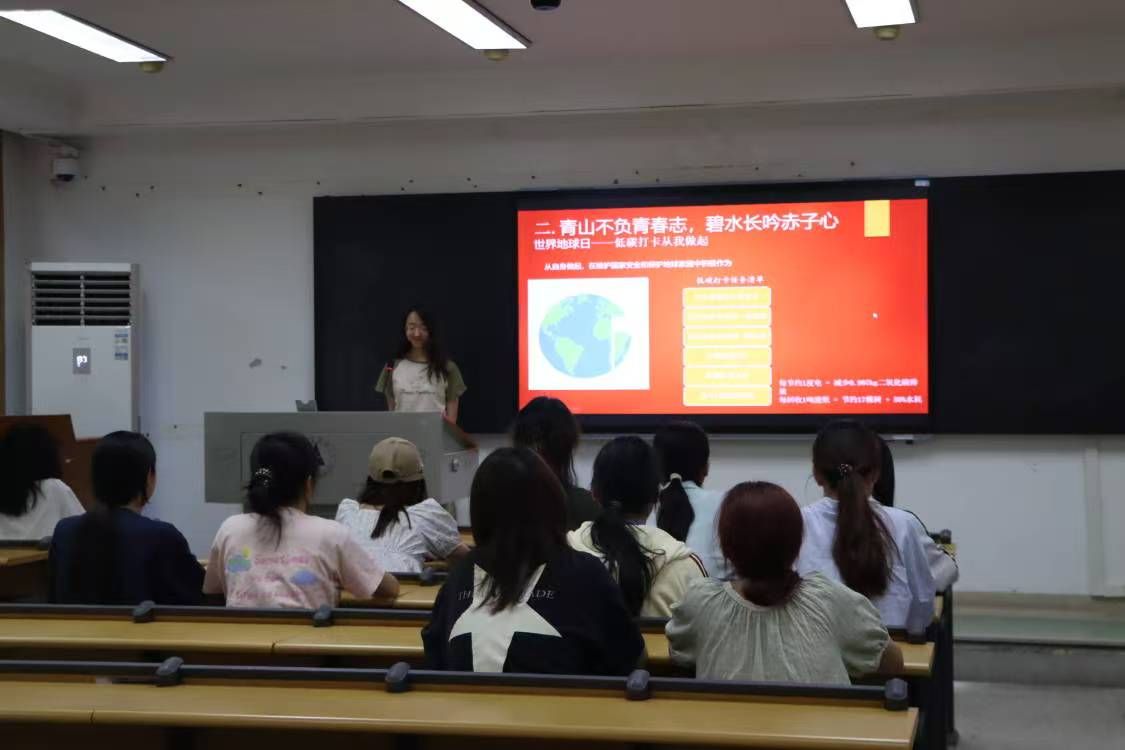 在第二部分“青山不负青春志,碧水长吟赤子心”中,程小珊介绍了目前世界上普遍存在的环境问题,并向大家介绍了“绿水青山就是金山银山”这一可持续发展理念,呼吁大家付出实际行动以保护生态环境,保护我们共同的家园,以实现经济可持续发展,人与自然和谐共生。随后周轶航、张雅雯、蒋蓉琪等同学依次上台表达了他们对于世界地球日的感想,同学们积极讨论。