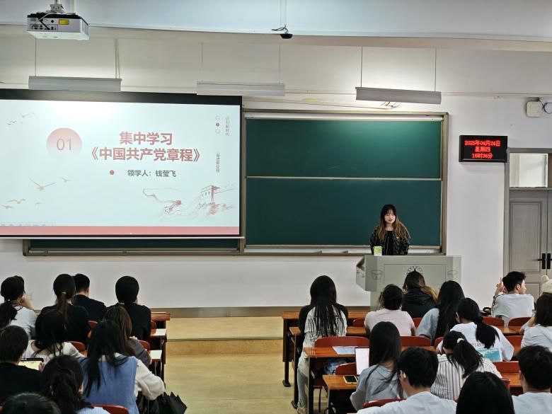 在党日活动中,全体党员齐唱国歌、重温入党誓词后,钱莹飞同学带领同学们学习《中国共产党章程》。通过第一条、第二条与第三条的解读,深入领会党章的精神实质与核心要义,进一步明确了党员的权利与义务,增强了党员的纪律意识和规矩意识。