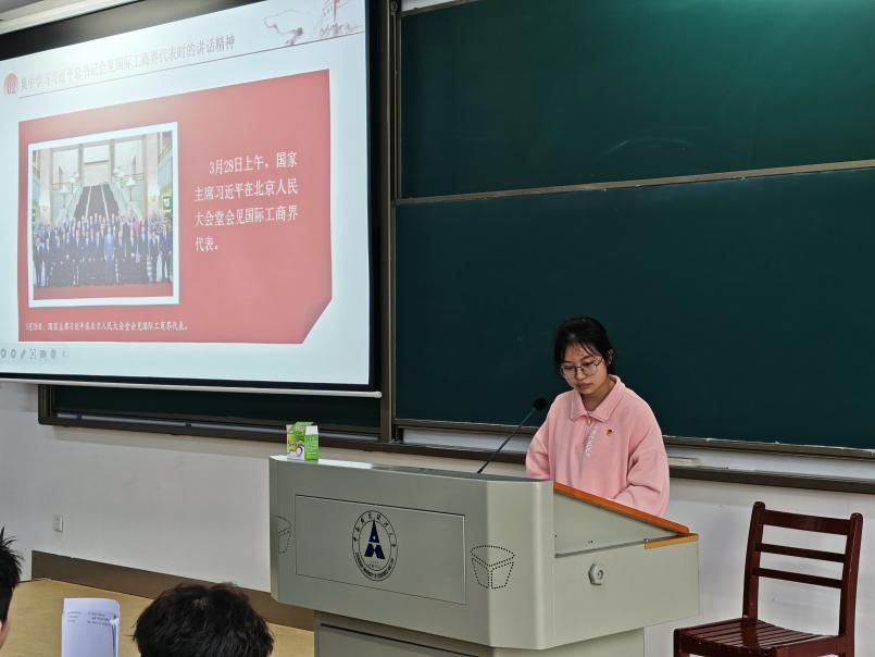 在集中学习环节,李晴萱同学领学《习近平会见国际工商界代表时的讲话》,深入解读习近平总书记关于中国坚持对外开放、推动经济高质量发展等重要理念,使党员们深刻认识到中国在国际舞台上的重要地位与大国责任。