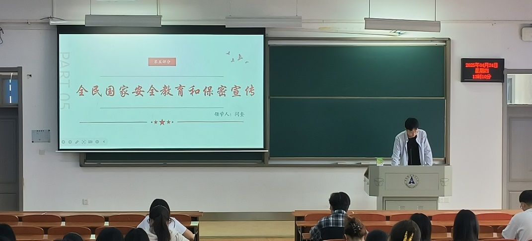最后由闵奎同学进行全民国家安全教育和保密宣传,围绕新修订的《保密法》进行全面解读,强调了坚持总体国家安全观,统筹发展与安全的重要性;此外闵奎同学通过互动问答的形式,让同学们对国家秘密的保密期限、大学生在国际学术交流中的保密要求以及发现他人买卖涉密文件的正确处理方式有了更清晰的认识。