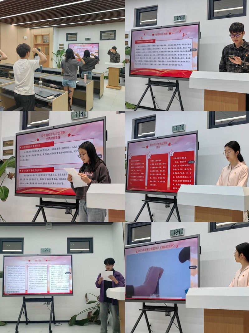 4月25日,工商管理本科生第二党支部发展对象和入党积极分子在南附201开展党日活动。活动伊始,全体成员齐声高唱国歌。在学习环节,韩东轩同学详细领学了《中国共产党章程》,深入解读了党员的权利与义务。随后,杨苗同学领学了《习近平:坚持以高质量发展统揽全局在中国式现代化进程中展现贵州新风采》,习近平总书记对贵州高质量发展的明确要求,为在场党员指明了地方发展的方向与路径。金亦桐同学领学了《习近平:解放思想改革创新奋发进取真抓实干在中国式现代化进程中开创云南发展新局面》,大家深刻认识到解放思想、改革创新在推动地区发展中的关键作用。范芳铭同学领学的《习近平:坚持和落实“两个毫不动摇”》,加深了党员们对我国经济制度的理解。陆克同学领学的《习近平:朝着建成科技强国的宏伟目标奋勇前进》,展示了我国科技事业的辉煌成就和未来发展方向。崔馨月同学领学的《习近平:汇聚共建美丽中国磅礴力量让祖国大地更加绿意盎然生机勃发》,让全体党员深刻领会到生态文明建设的重要意义。最后,马艳萍同学再次强调国家安全和保密工作的重要性。同学们集体观看 4·15 全民国家安全教育日主题视频以及参与“共筑保密防线公民人人有责”网络保密知识竞答活动。
