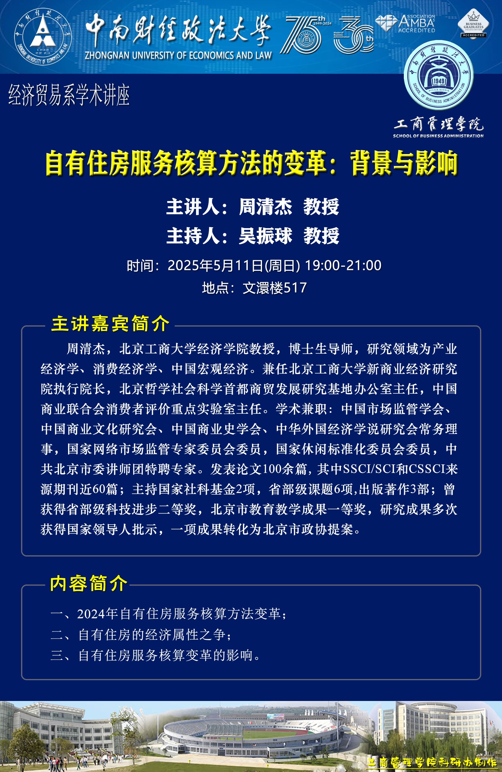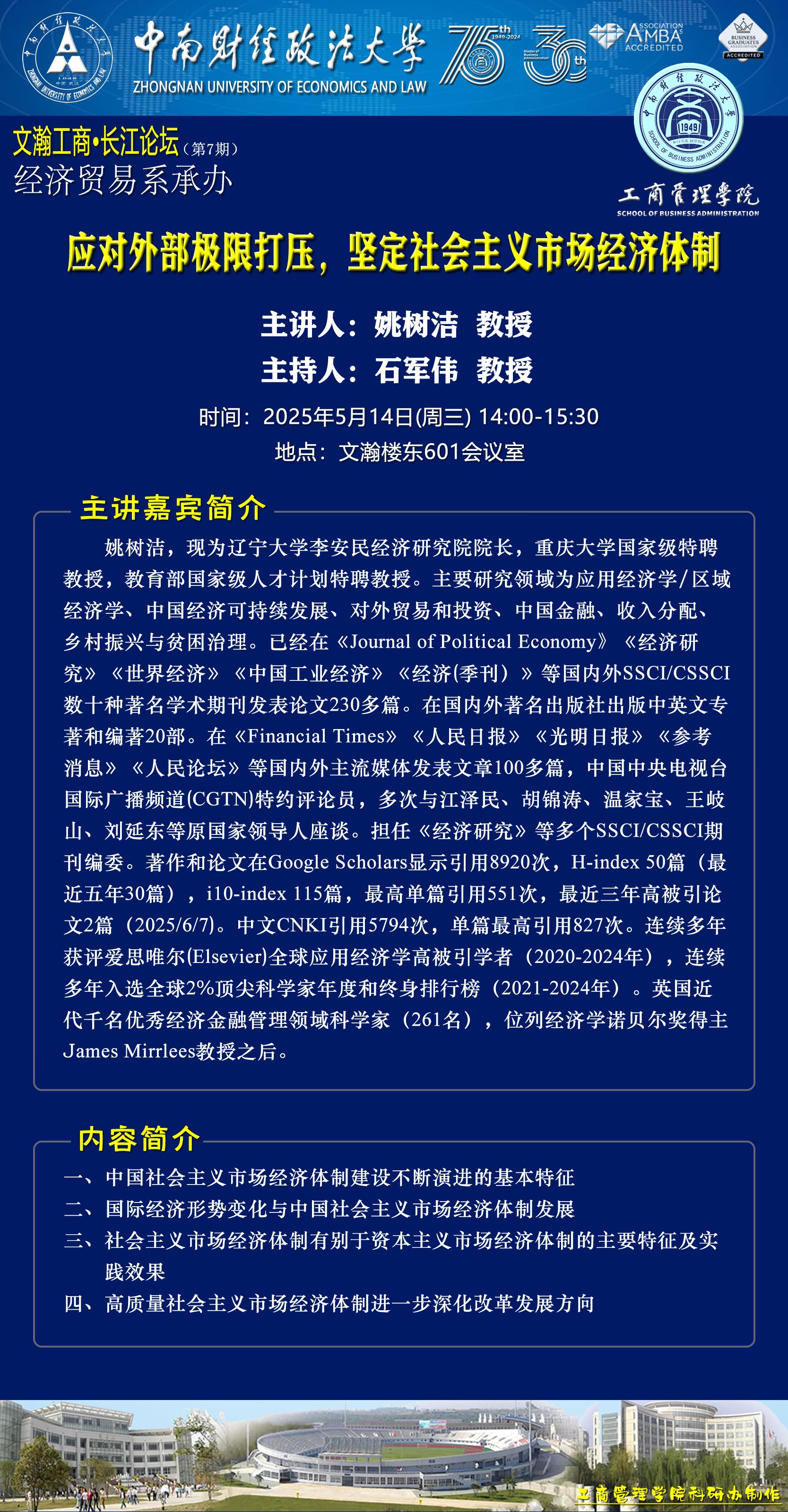 时间地点主办单位主持人主讲人主题2025.05.11 19:00-21:00文澴楼517经济贸易系吴振球 教授周清杰 教授自有住房服务核算方法的变革:背景与影响2025.05.14 14:00-15:30文瀚楼东601文瀚工商•长江论坛(第7期)经济贸易系承办石军伟 教授姚树洁 教授应对外部极限打压,坚定社会主义市场经济体制2025.05.16 14:00-17:00文翰楼东601文瀚工商•长江论坛(第8期)人力资源管理系承办韩翼 教授林海芬 教授主题一:案例研究范式与过程主题二:教学案例交流与指导