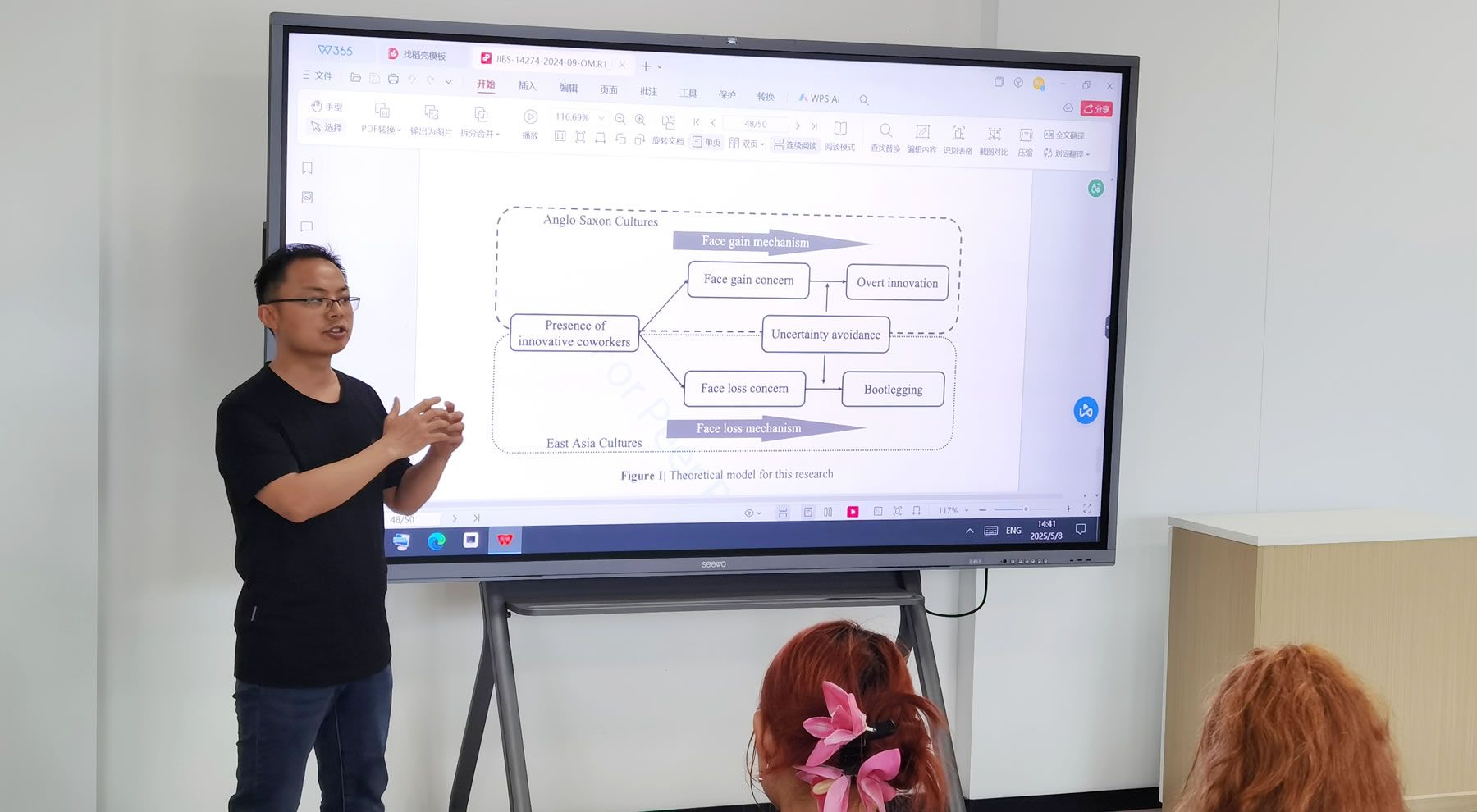 and Covert Innovation Across Cultures》。讲座聚焦于文化差异背景下,员工在创新过程中如何平衡“面子”心理与不确定性规避倾向。汤教授结合两项跨国研究指出,在低不确定性规避文化中,员工更可能出于“争面子”的动机参与“显性创新”,而在高不确定性规避文化中,则倾向于因“怕丢面子”而采取“隐形创新”策略。该研究挑战了传统观点,丰富了对组织行为跨文化适应机制的理解。