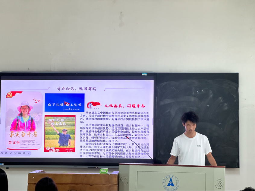 “青春立志绽芳华,扎根基层书新章”在第二篇章中,同学们一同回顾了五四青年百年来的奋斗历程,从新民主主义革命时期的爱国运动到新时代的乡村振兴实践,青年始终是推动国家发展的先锋力量。通过学习马克思主义中国化时代化的理论成果,同学们深刻体会到扎根基层的重要意义。活动中,大家结合专业特色,探讨如何运用互联网技术助力乡村振兴,如何在基层治理中发挥青年智慧,展现了“强国有我”的青春担当。