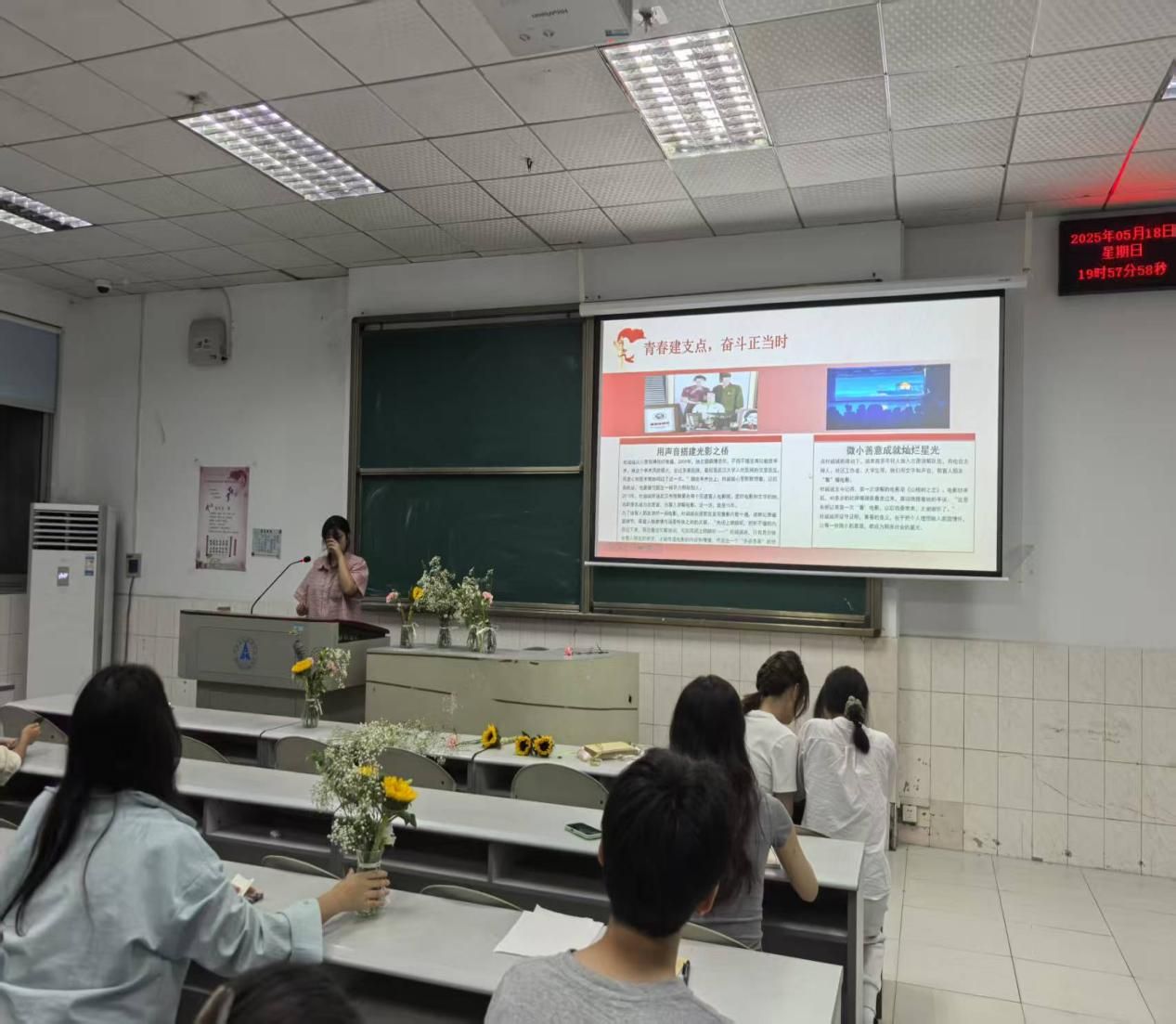 会议开始,大家在主持人陈简然的带领下齐唱中国共青团团歌,随后陈简然同学引领大家进行第一部分“青春建支点,奋斗正当时”活动,进行“五四精神与回信精神”理论讲解,带领同学们回顾五四运动历史背景,解读“爱国、进步、民主、科学”的精神内涵。学习习近平总书记给青年的重要回信,探讨新时代青年的责任与担当。