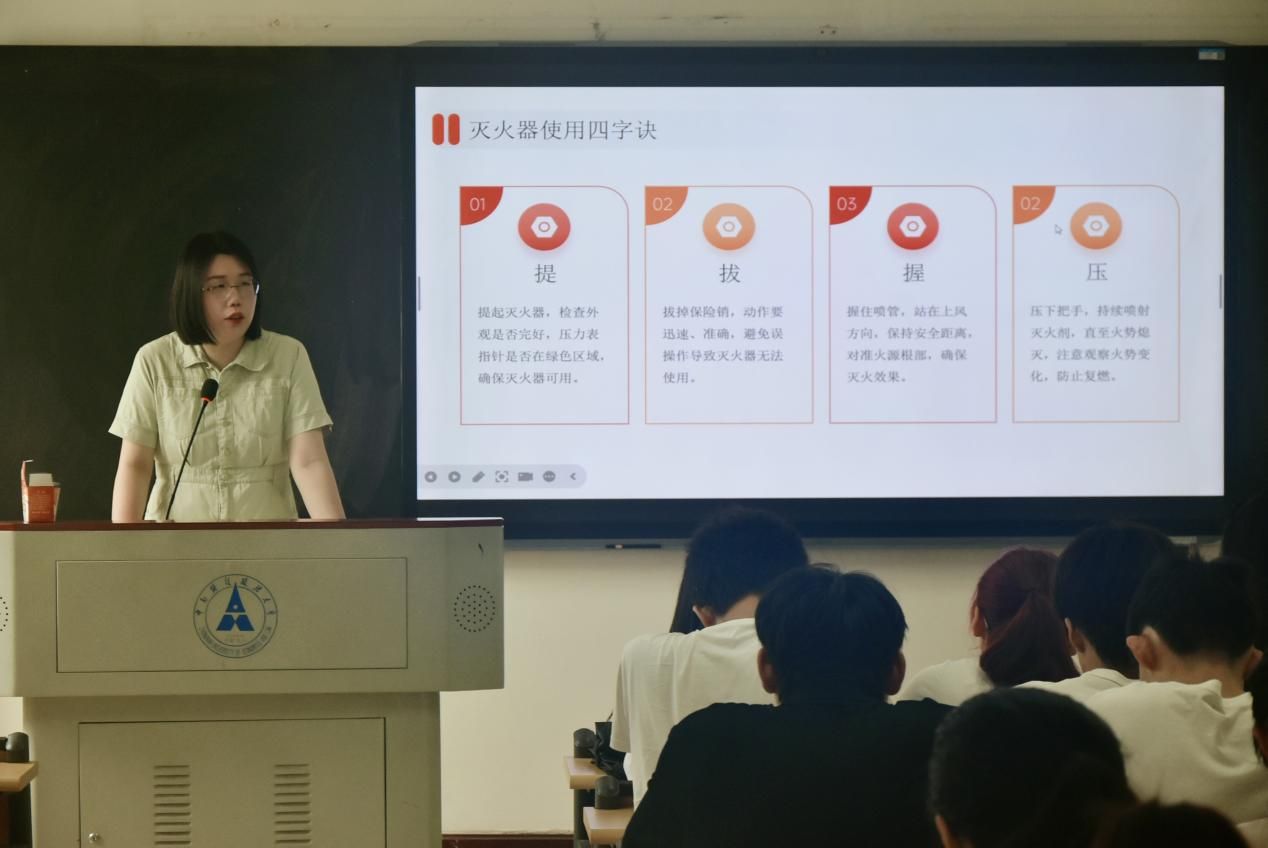 敲响安全警钟,筑牢消防防线。随后,范梦宇老师开展了《筑牢校园安全防线——消防安全培训》主题微课。范梦宇老师以多起触目惊心的实际案例为引,为全体人员敲响安全警钟。高校宿舍火灾、充电宝排插等使用不当引发的事故、学生公寓内吸烟埋下的隐患,无不暴露出学生在安全意识与行为规范上的短板。范老师强调,务必使用合格电器产品,从源头上消除安全隐患。同时,她还深入细致地介绍了火灾应急措施。火灾发生时,要迅速拨打校园报警电话,保持通讯畅通,并在路口引导消防车及时抵达;使用灭火器时,牢记“提拔握压”口诀,使用前仔细检查压力表指针是否处于绿色安全区域;逃生过程中,要熟悉逃生通道,切勿乘坐电梯,根据门把手温度灵活判断逃生方式,成功逃生后迅速撤离至安全区域集结。一系列专业且实用的指导,为学生在面对火灾时如何保护自身安全提供了清晰指南。