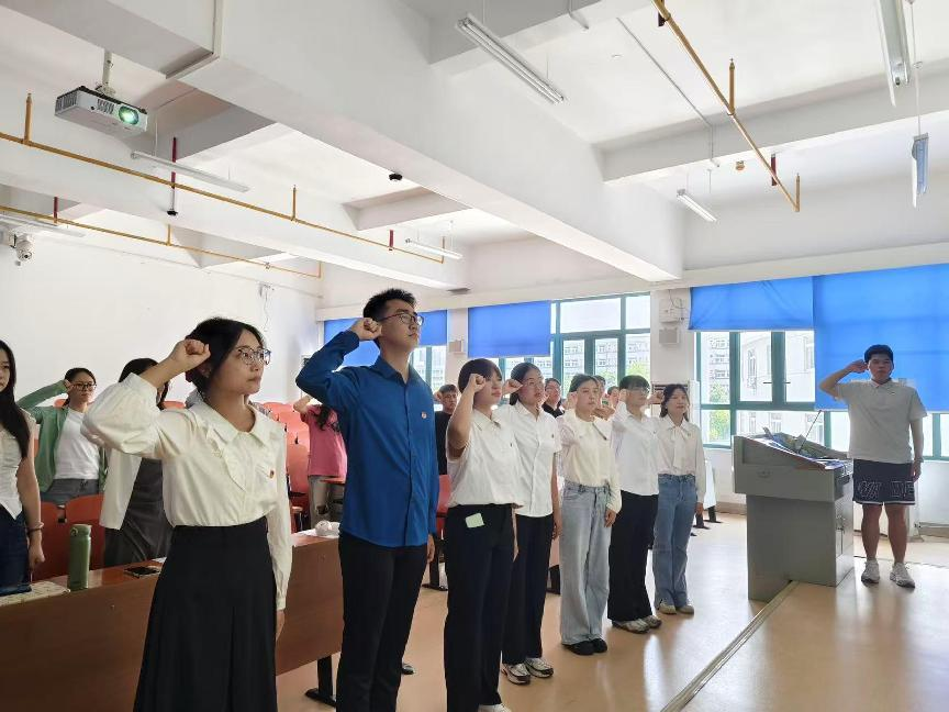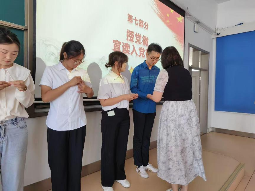 党支部书记范梦宇老师为新接收的预备党员授戴党员徽章后,全体人员面对着鲜红的党旗,郑重地举起了右拳,以庄严的宣誓表达对中国共产党的忠诚与为共产主义事业奋斗终身的决心。