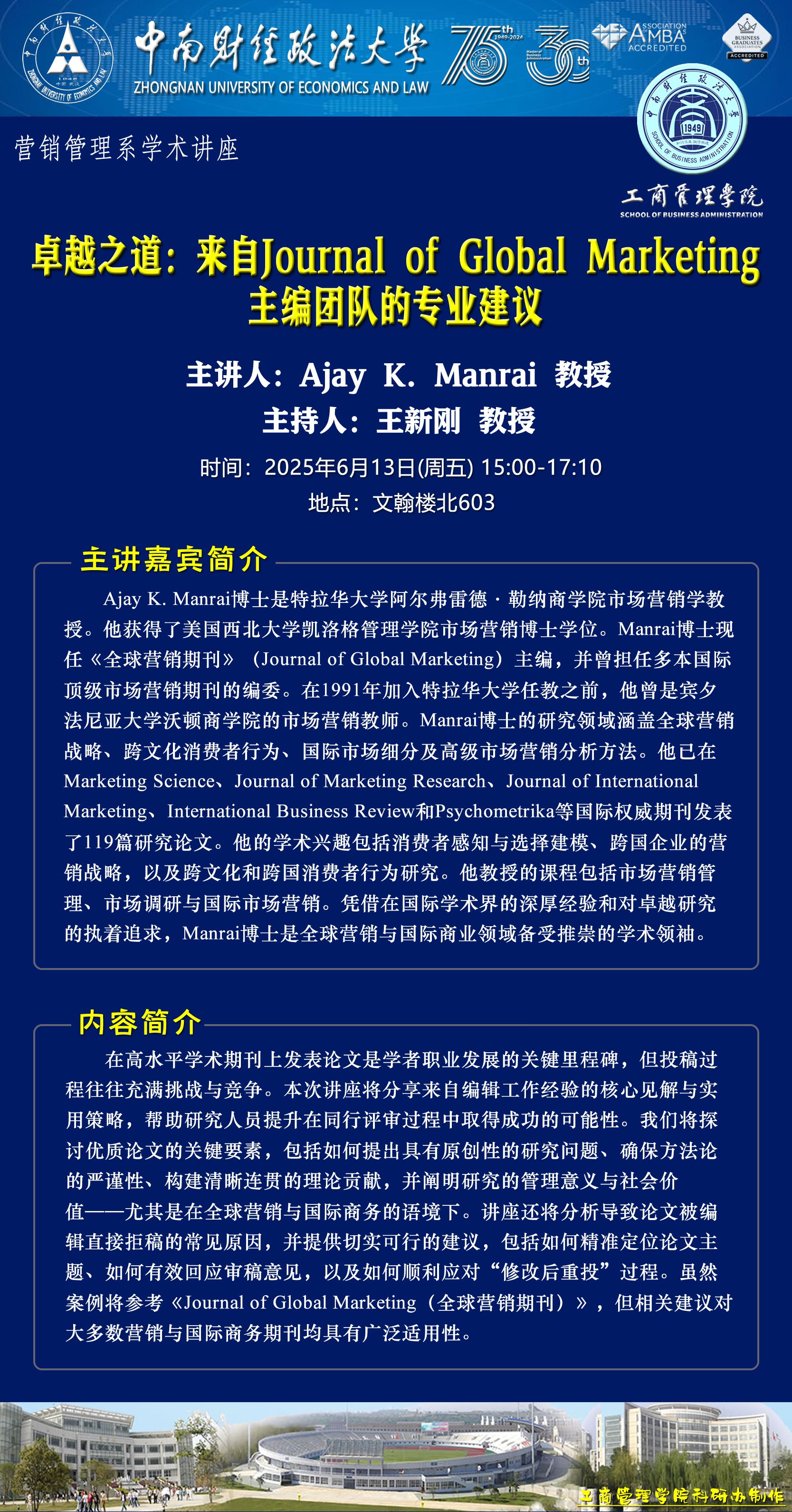 时间地点主办单位主持人主讲人主题2025.06.13 15:00-17:10文瀚楼北603营销管理系王新刚 教授Ajay K. Manrai 教授卓越之道:来自Journal of Global Marketing主编团队的专业建议