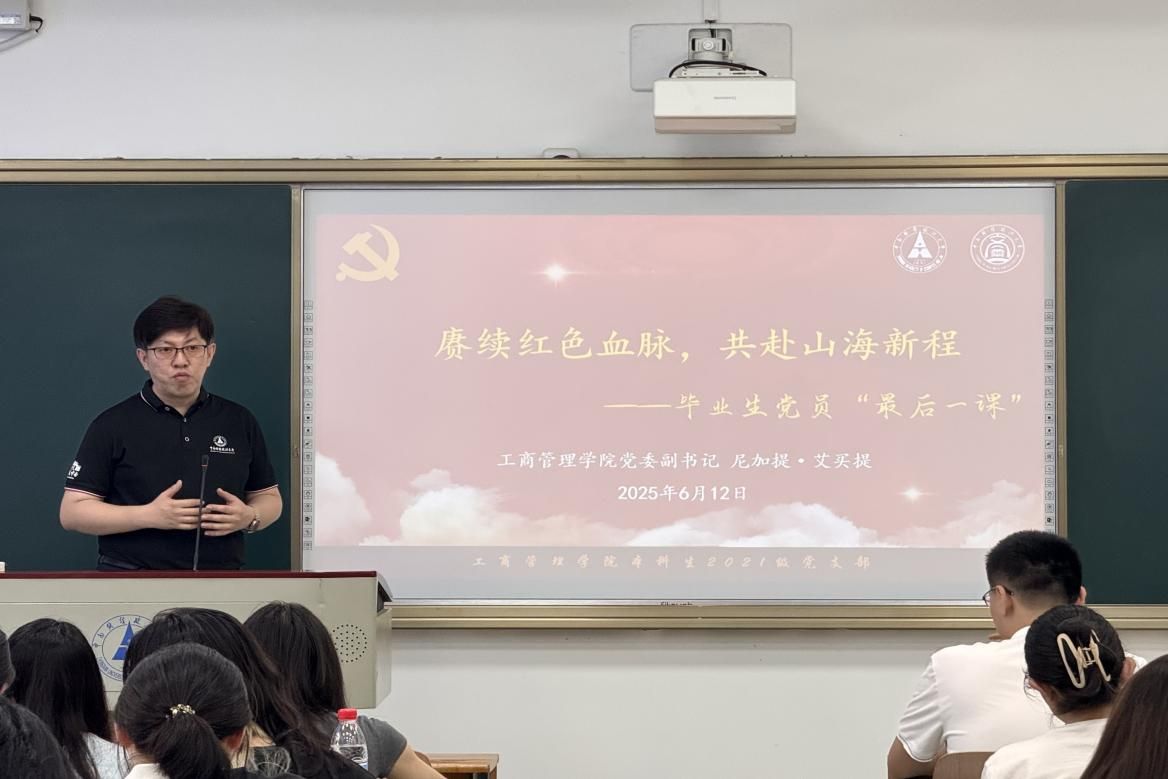 为扎实开展深入贯彻中央八项规定精神学习教育,重点加强党性教育和纪律教育,进一步强化毕业生党员政治意识、身份意识和廉洁意识,引导毕业生党员坚定理想信念、加强党性修养,将中央八项规定及其实施细则精神内化于心、外化于行,在后续学习、工作、生活中继续传承弘扬党的优良作风,发挥好先锋模范作用。工商管理学院于2025年6月12日在文泰楼318举行本科毕业生党员“最后一课”主题教育活动。本次活动邀请了学院党委副书记尼加提·艾买提主讲,本科生2021级辅导员南天亮主持,全体毕业生党员参加。