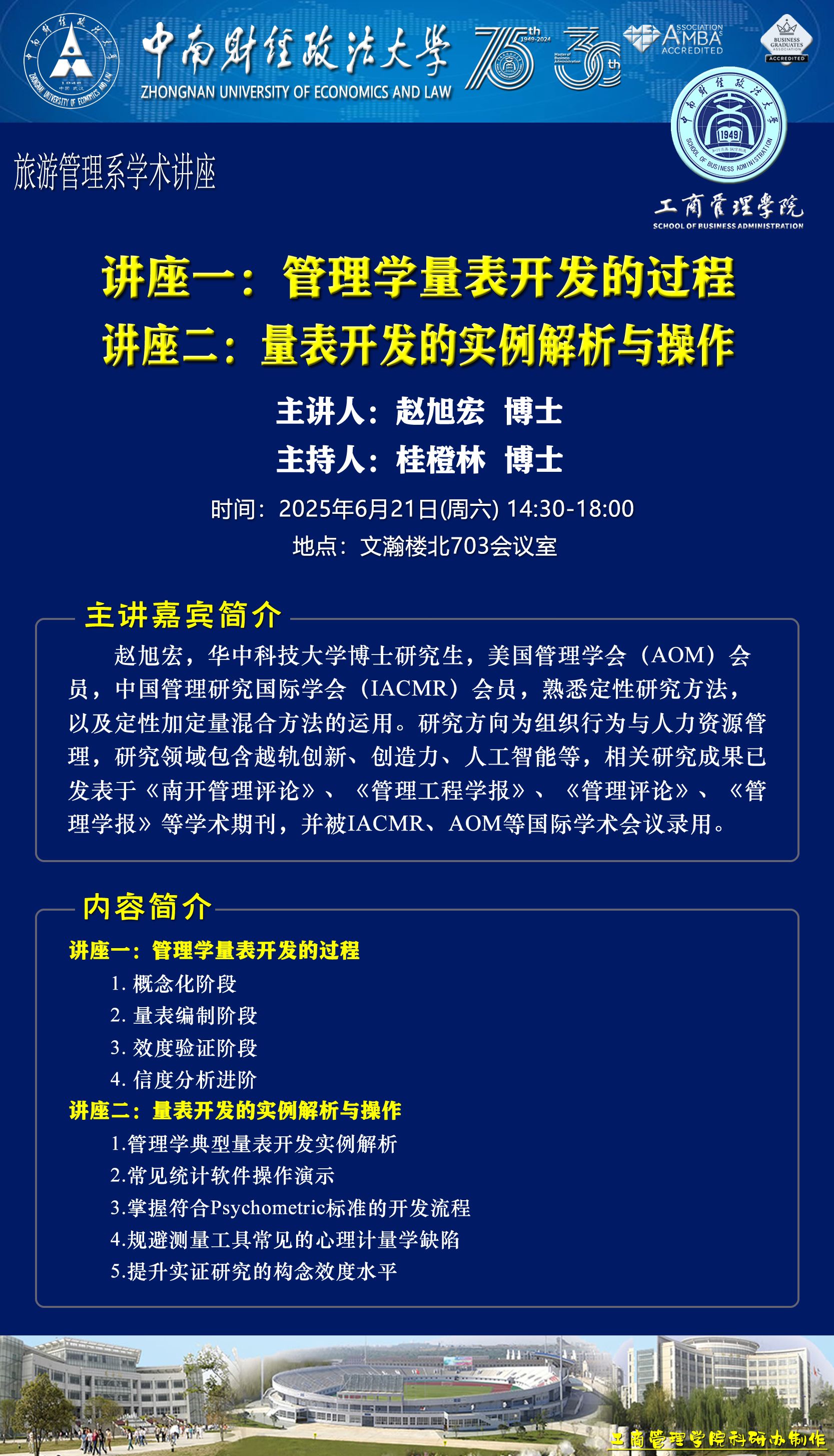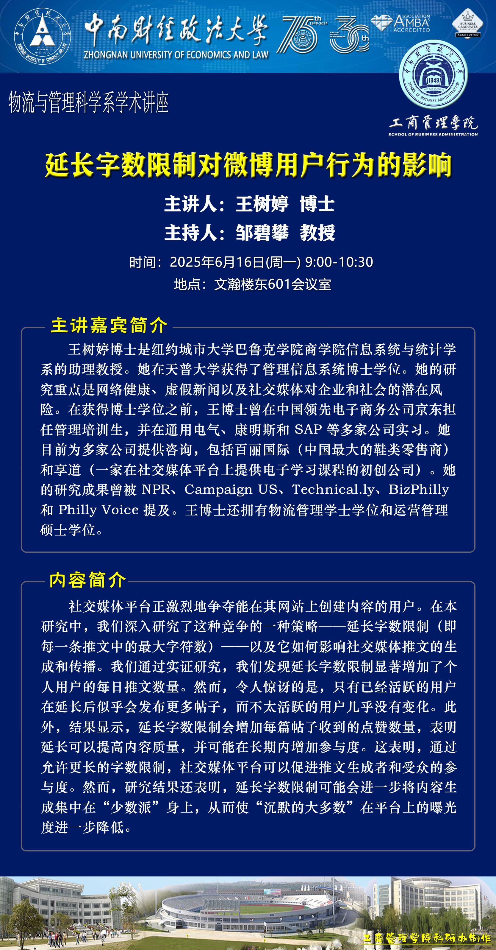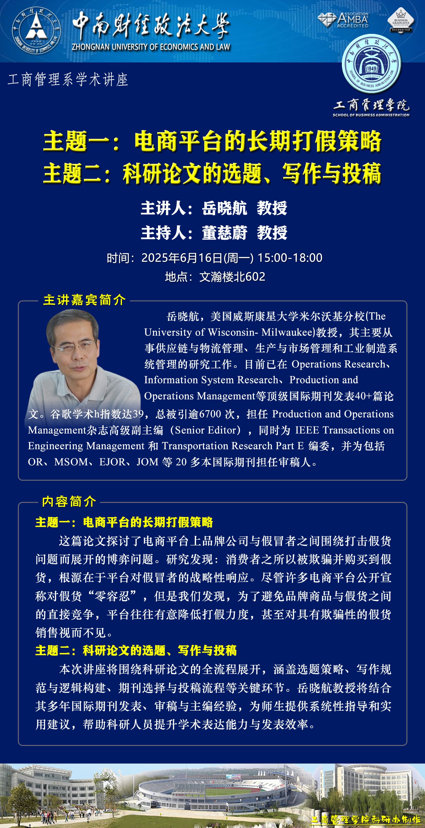 时间地点主办单位主持人主讲人主题2025.06.16 9:00-10:30文瀚楼东601运营与供应链管理系邹碧攀 教授王树婷 博士延长字数限制对微博用户行为的影响2025.06.16 15:00-18:00文瀚楼北602工商管理系董慈蔚 教授岳晓航 教授主题一:电商平台的长期打假策略主题二:科研论文的选题、写作与投稿2025.06.17 9:30-11:00文瀚楼北603工商管理系董慈蔚 教授刘云川 教授序贯竞争中的贝叶斯说服与交叉揭示下的信息操控2025.06.18 15:00-17:30文瀚楼北703会议室工商管理系石军伟 教授冯志钢 副教授人工智能、数据分析与战略决策2025.06.20 14:00-16:00文瀚楼东601工商管理系、人力资源管理系赵君 教授霍伟伟 教授数智人才选拔的研究探索与教学实践2025.06.21 14:30-18:00文瀚楼北703旅游管理系桂橙林 博士赵旭宏 博士主题一:管理学量表开发的过程主题二:量表开发的实例解析与操作