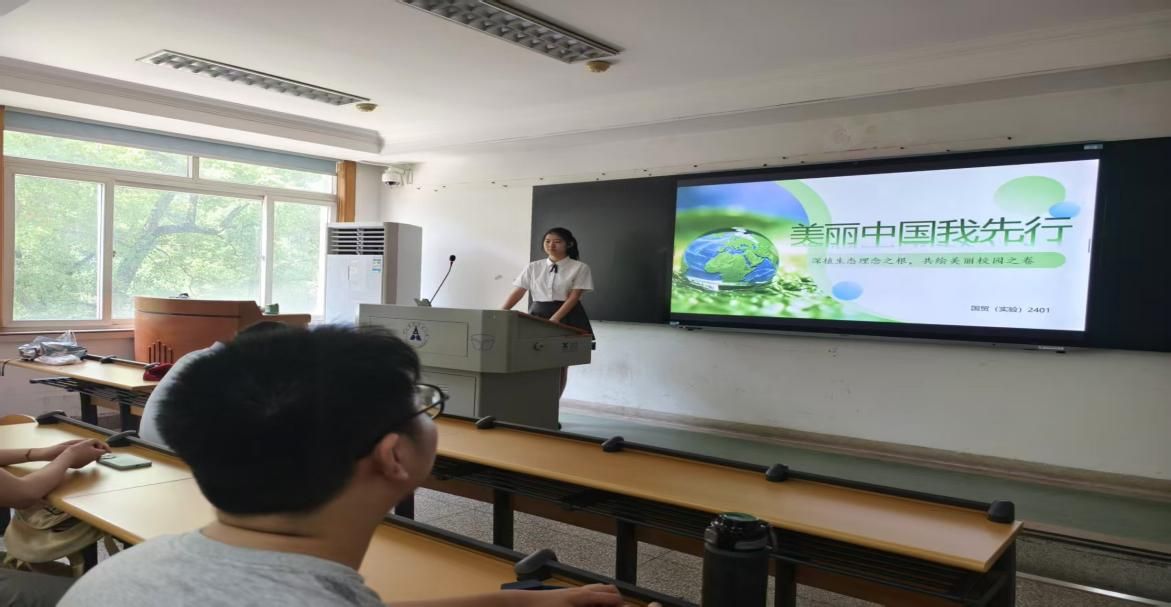 “深植生态理念之根,共绘美丽校园之卷”,该部分由杜佳宜同学主持,2025年是习近平总书记提出‘绿水青山就是金山银山’理念二十周年。为培育和弘扬生态文化,汇聚起全校更多的正能量,让生态文明理念进一步深入人心,团支部以“美丽中国我先行”为主题开展生态环境教育,通过班会课形式,深入学习贯彻习近平生态文明思想,进一步引导同学们支持和参与环境保护,共同建设美丽校园。