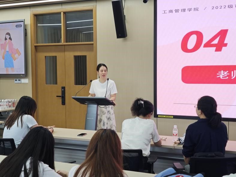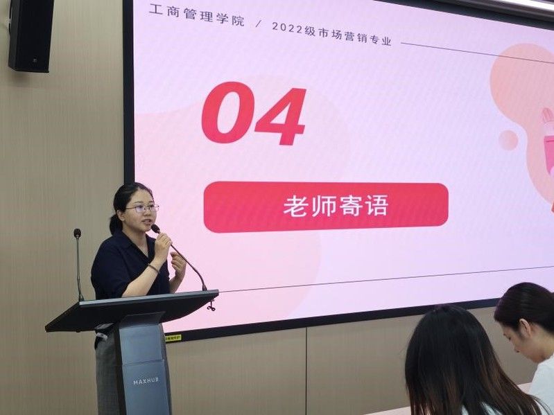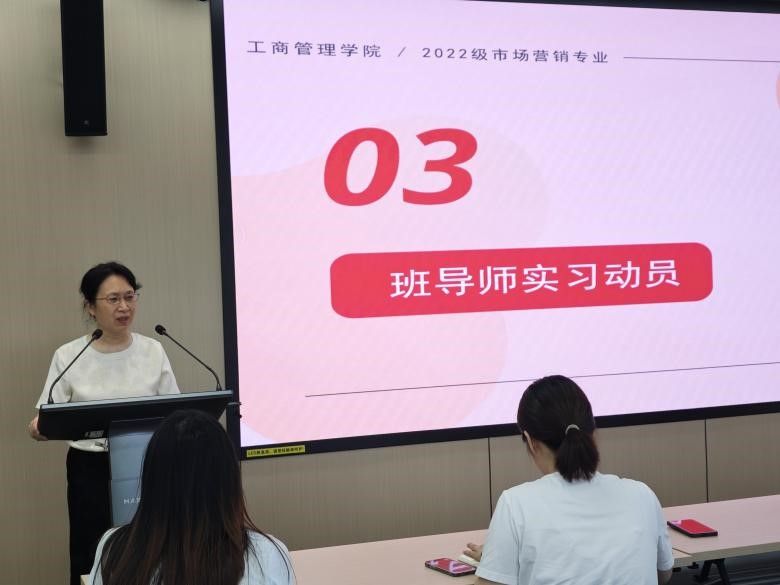 实习动员环节,市营2202班班导马瑞婧老师强调实习对职业能力提升的作用,建议同学利用暑假对接实习单位,结合专业方向规划实践路径,为大四就业或深造积累经验。同时,马老师提倡同学们锻炼情商,提升人际沟通能力;市营2201班班导郭麦菊老师从成长角度发言,提醒同学在实习中注重沟通能力与问题解决能力的培养,珍惜实践机会,并热情欢迎同学们多多与她沟通。