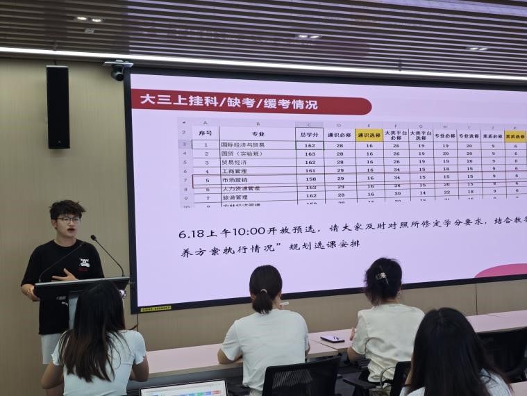 市营2202班学习委员李栋同学以“诚信应考,规划先行”为核心展开讲解。首先他强调期末考试纪律,明确数字营销考试的时间,提醒同学查询教务部考试安排,其次李栋同学还结合大三上学期挂科、缺考及缓考数据,分析专业学分完成情况,提醒同学对照培养方案核查学分进度。此外,他提到暑假后需提交学年论文,建议同学提前与本科导师沟通,为毕业论文做准备。