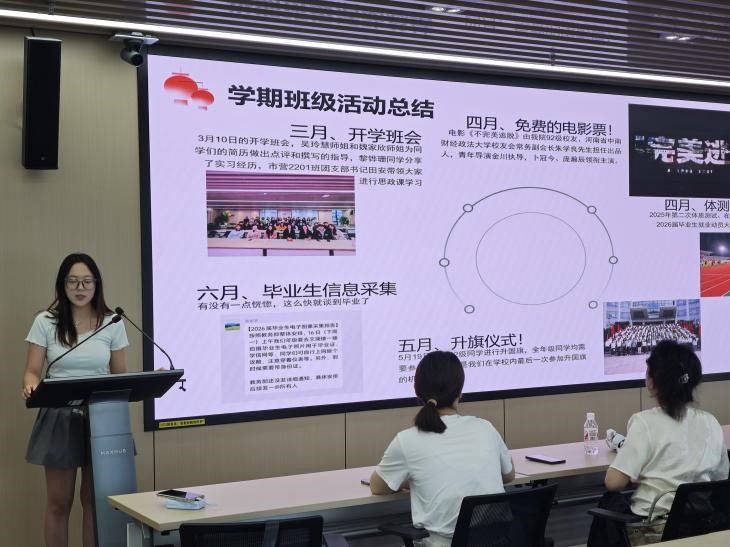 市营2201班班长苏思盈同学带领大家回顾学期活动。从3月开学班会、4月学院组织免费观影,到5月2022级同学进行了升旗仪式,再到6月启动毕业生信息采集,细数过往,苏思盈同学感慨时间飞逝,呼吁大家珍惜最后的校园时光。