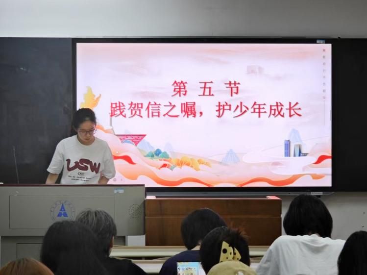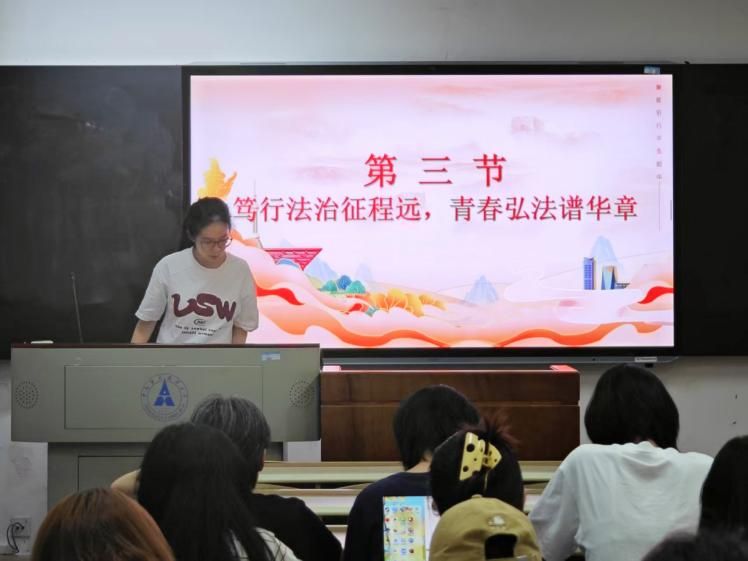 笃行法治征程远,青春弘法谱华章。高若茗同学讲解了青年应该如何学法用法,运用法律保护自身权益。我们要建立系统性法律认知框架,要理解中国特色社会主义法治体系的内涵;要培育法治信仰,将尊法学法守法用法转化为内在价值追求。她特别结合党的二十届三中全会关于完善法治体系的要求,阐释了法治实践与青年成长的密切关系,激励同学们在全面建设社会主义现代化国家的新征程中展现青春担当。