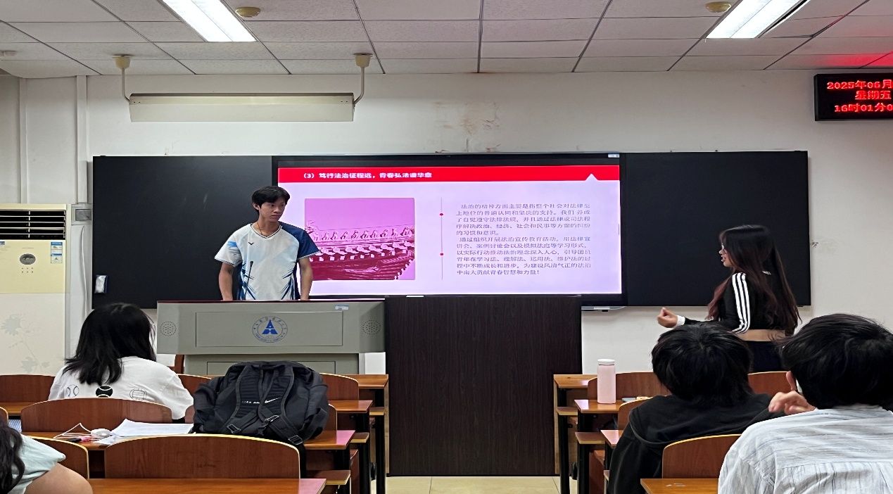 活动在庄严的国歌声中拉开序幕。全体成员齐唱国歌、团歌,在激昂旋律中厚植家国情怀。随后,主持人以“笃行法治征程远,青春弘法谱华章”为主题,开展国家法制与法治安全学习分享会,围绕国家安全法、网络安全法等内容,结合典型案例剖析,强调法治建设对国家发展的重要性。“当听到电信诈骗案例中骗子利用法律漏洞实施犯罪时,我深刻意识到青年学法懂法的紧迫性。”团员李同学分享道。