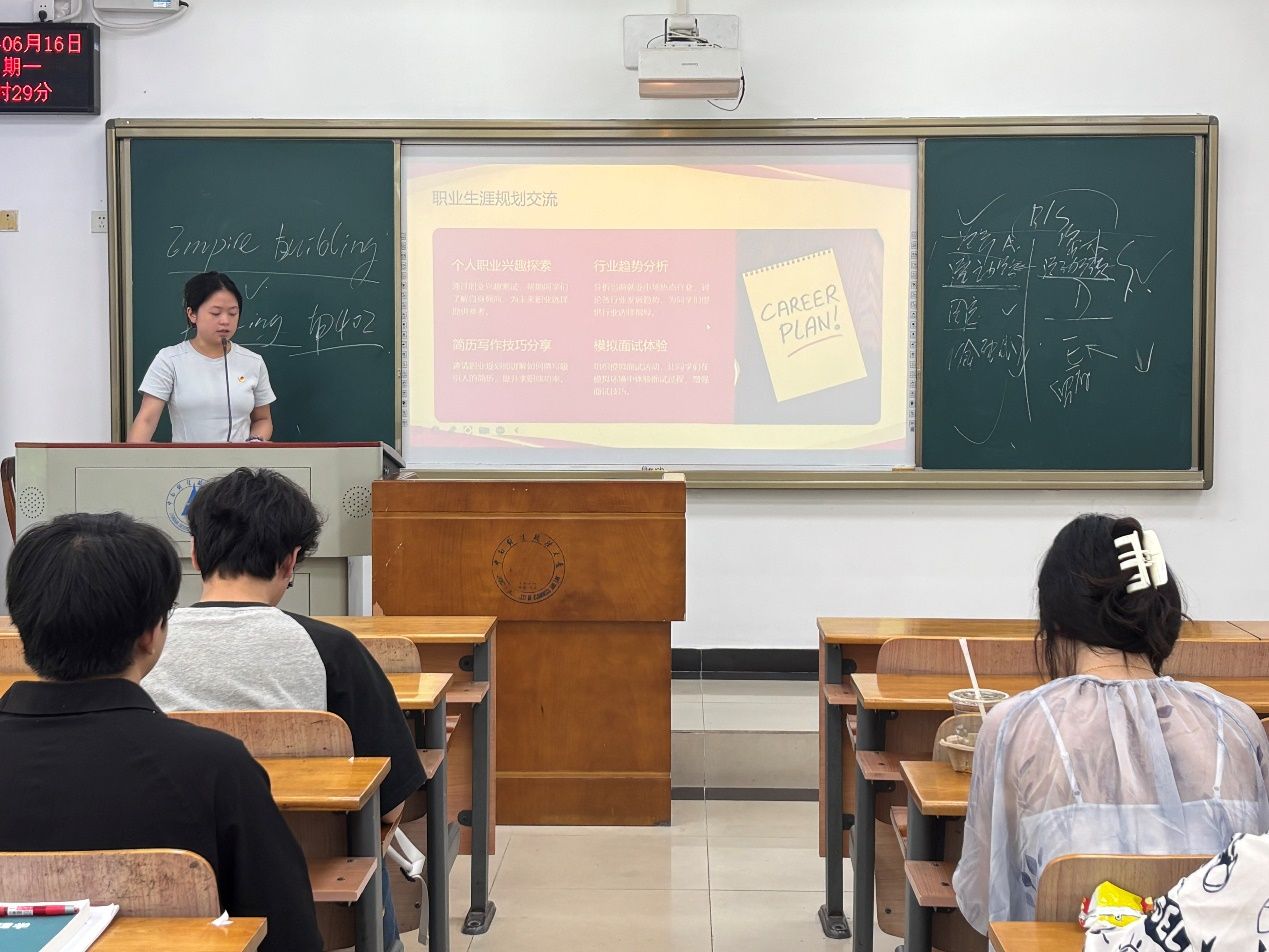 职规为本,诚信为基。辅导员何强老师曾在联合班会上强调了明确的个人发展方向的必要性。就此,吴瑾同学为大家提供了不同的职业规划方法,并转达了学校就业指导中心的老师们随时期待为同学们提供咨询与辅导服务的热心关切。最后,临近期末考试,吴瑾同学向大家强调了考风考纪,要求大家诚信应考、积极备考,也预祝大家都能取得理想的好成绩。