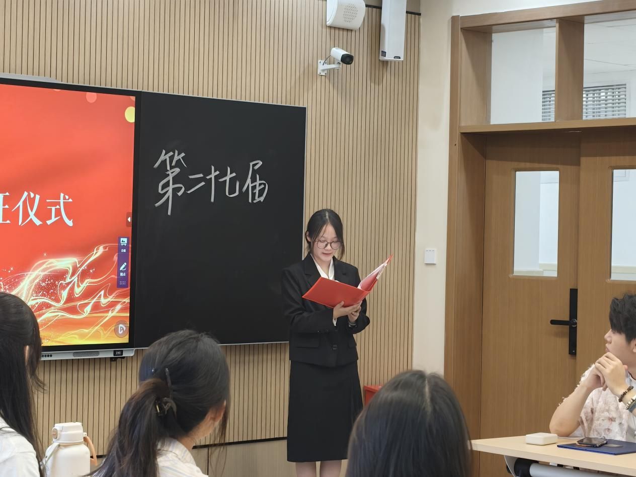 仪式在热烈的掌声中拉开序幕,由学院团委书记何强老师与团委副书记刘振兴老师莅临指导。活动首项议程,第二十七届团学志各部门负责人依次发言。他们深情回顾在任期间的工作历程,从组织建设的点滴推进,到活动开展的创意碰撞;从部门协作的磨合成长,到服务同学的温暖瞬间,将积累的经验、遇到的挑战及解决方案倾囊相授。言语间,满是团学志工作的热爱与不舍,更传递着“功成不必在我,功成必定有我”的责任担当,为第二十八届负责人筑牢前行基础。