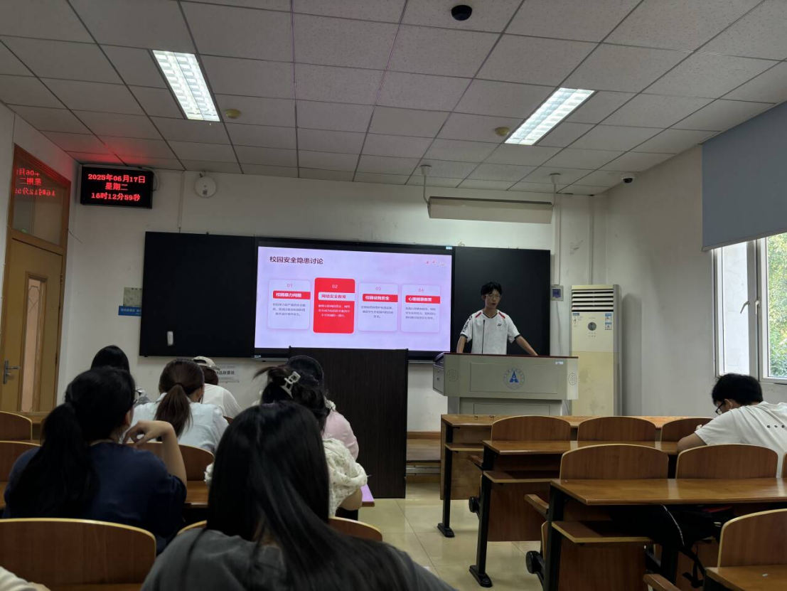 工商2407团支部耿子涵同学围绕“人人讲安全、个个会应急——查找身边安全隐患”的主题开展校园安全知识的理念学习。2025年6月是全国第24个“安全生产月”,普及安全教育,可以提高同学们的应急响应能力,提高学校安全防范水平。在观看了一部安全教育警示片后,主持人带领大家通过校园安全知识竞答、校园安全隐患讨论等有趣的形式了解了校园安全知识,增强同学们的安全防范意识。