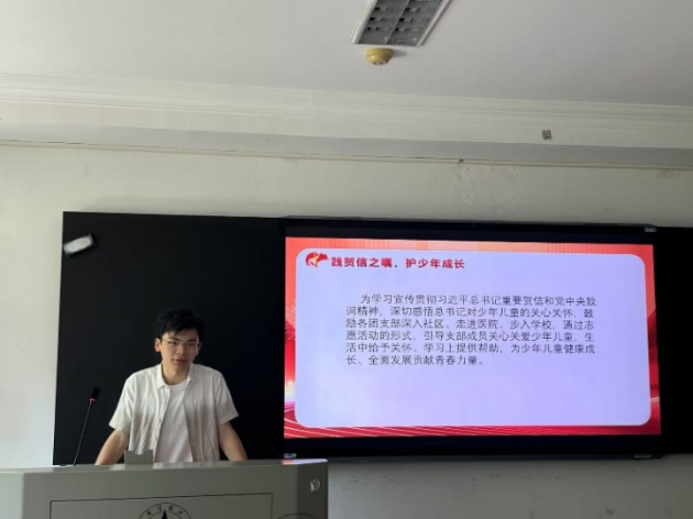 工商2406团支部张福麟带领同学们学习贺信的相关内容,解读贺信中对青少年成长的期望和嘱托。结合学校组织的支教活动经历,分享了如何在实践中关心和帮助少年儿童成长。例如,通过耐心辅导功课、开展有趣的课外活动,激发孩子们的学习兴趣和自信心。同学们还一起讨论了在日常生活中可以通过哪些方式为少年儿童的成长贡献力量,如参与社区的儿童关爱活动、为贫困地区的孩子捐赠书籍和文具等。