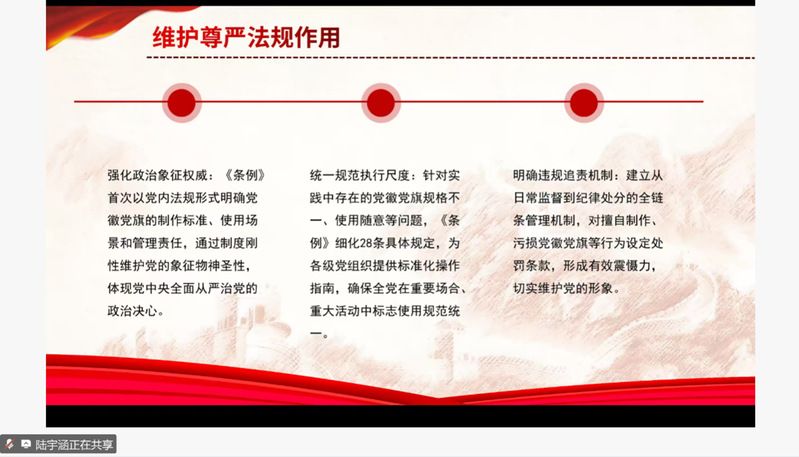 然后,刘馨忆同学领学了《中国共产党党徽党旗条例》。她围绕《中国共产党党徽党旗条例》出台的背景与意义、党徽党旗的象征意义、党徽党旗的制作规范、使用规范、管理规范等方面进行讲解,激励支部成员不忘初心、牢记使命,坚定理想信念,团结带领全国各族人民在党的旗帜下奋勇前进。
