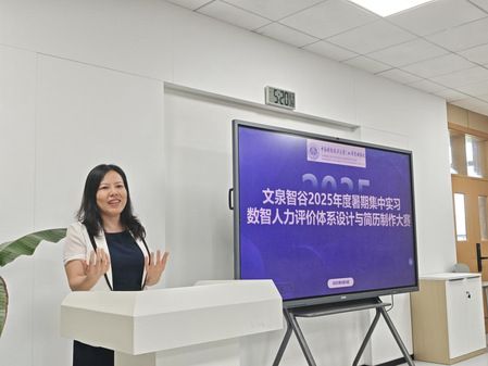 (通讯员:徐静)2025 年 8 月 4 日下午 2 点 30 分,文瀚楼东 601 阶梯会议室内座无虚席,2025年度暑期人力资源集中实习成果汇报暨数智人力评价体系设计与简历制作比赛在此拉开帷幕,这既是对1个月集中实习成果的检验也是对数智人力资源转型的探索。出席本次活动的嘉宾有武汉数文科技人事与行政总监方国芳女士、武汉文泉智谷教育科技有限公司代表梁宇琦硕士师姐,还有实习带队老师赵琛徽教授和邢志杰老师。活动由工商管理学院人力资源管理专业实习生何怡原主持。