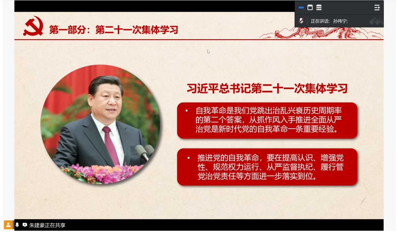 大会第二项,由孙祎宁同志领学习近平总书记在中央政治局第二十一次集体学习时的重要讲话精神。支部学习到,推进党的自我革命,要在提高认识、增强党性、规范权力运行、从严监督执纪、履行管党治党责任等方面进一步落实到位。