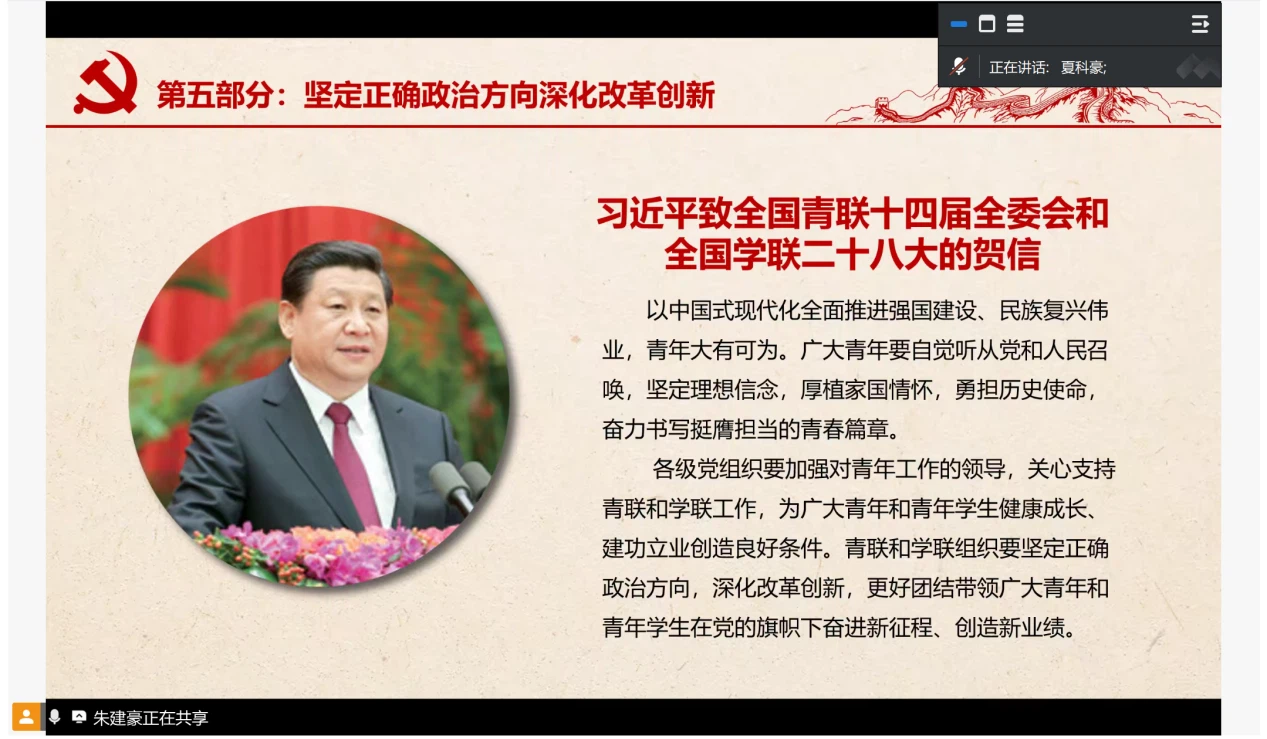 大会第五项,由夏科豪同志带领支部围绕“坚定正确政治方向深化改革创新”主题展开理论学习。学习围绕党的政治建设核心要求,解读了党对教育事业全面领导的深刻内涵,强调青联和学联组织要坚定正确政治方向,深化改革创新,更好团结带领广大青年和青年学生在党的旗帜下奋进新征程、创造新业绩。