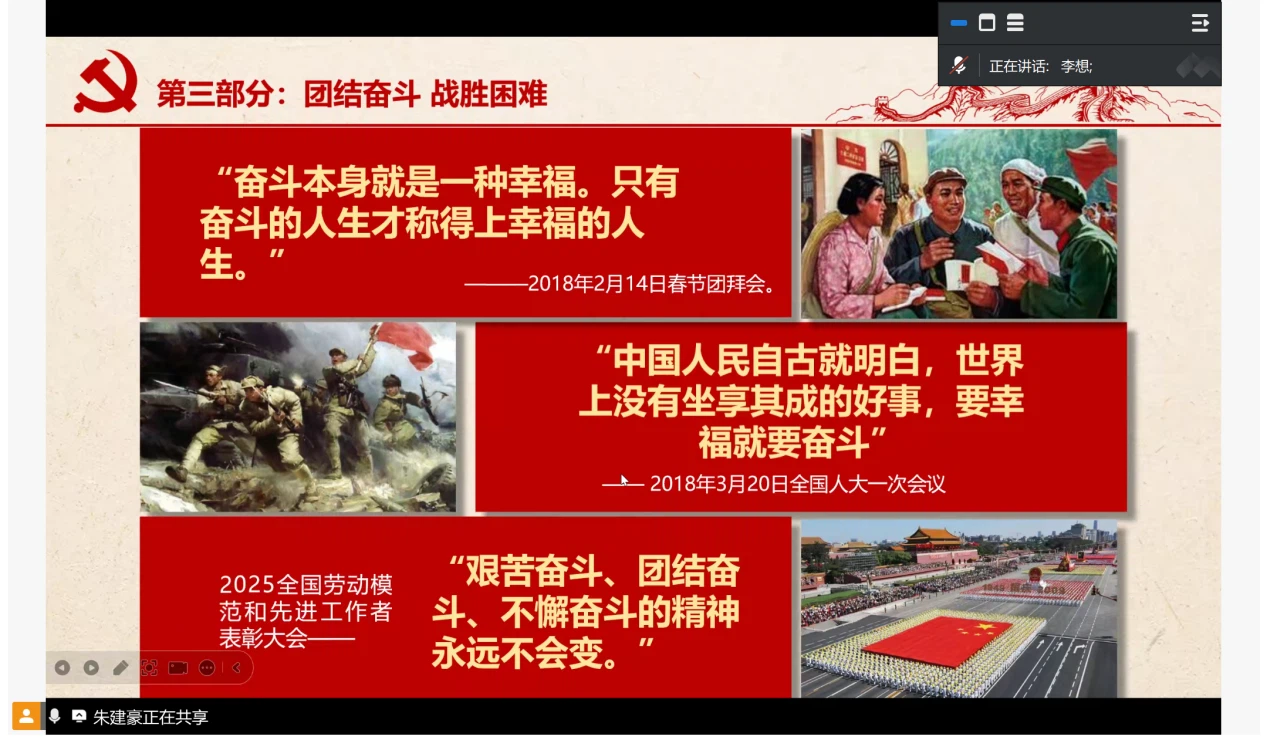 大会第四项,李想同志带领支部成员学习习近平总书记关于团结奋斗的重要论述。李想同志阐释了习近平总书记有关团结奋斗的重要论述内涵,强调民族复兴的使命要靠奋斗来实现,人生理想的风帆要靠奋斗来扬起。