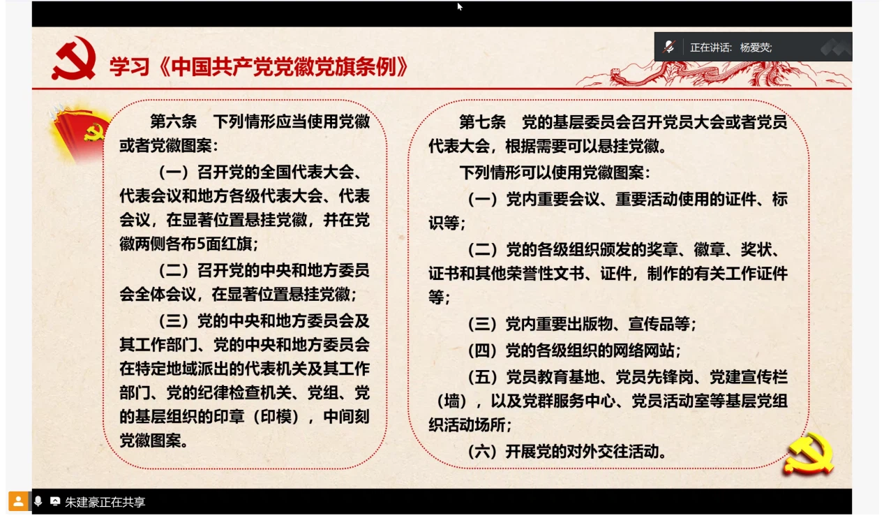 大会第六项,杨爱荧同志带领支部学习《中国共产党党徽党旗条例》,明确党徽党旗的制作规范、使用场景和维护要求,强调其作为党的象征和标志的政治意义。