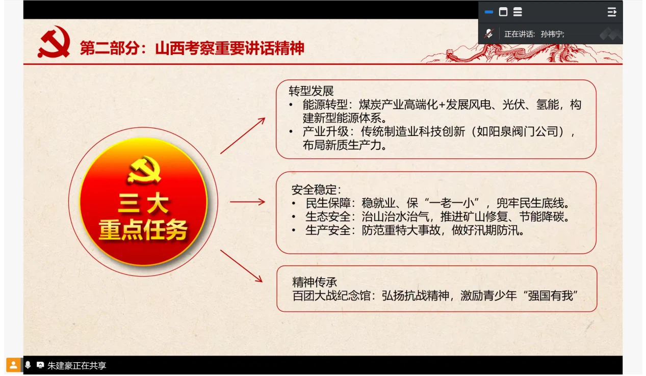 大会第三项,学习贯彻习近平总书记在山西考察时的重要讲话精神。孙祎宁同志围绕资源型经济转型的战略定位,详细解读了“转型发展”“安全稳定”“精神传承”三大重点任务。学习过程中,支部成员意识到面对产业转型等问题,青年党员应立足学科优势,为区域高质量发展贡献智慧。