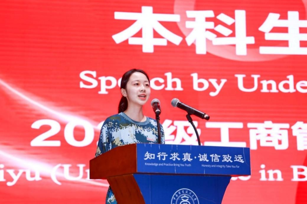 本科生新生代表蔡思羽以“揽星衔月逐日光 接力奋进新征程”为主题,自信讲述她选择中南大,坚定成为中南大“商科青年”的求知之旅。面对大学生活,她满怀憧憬,她坚信任何伟大的商业实践都离不开扎实理论根基的支撑,新时代商科青年当怀“揽星衔月逐日光”之志,在青春的赛道上跑出这一代人的最好成绩!