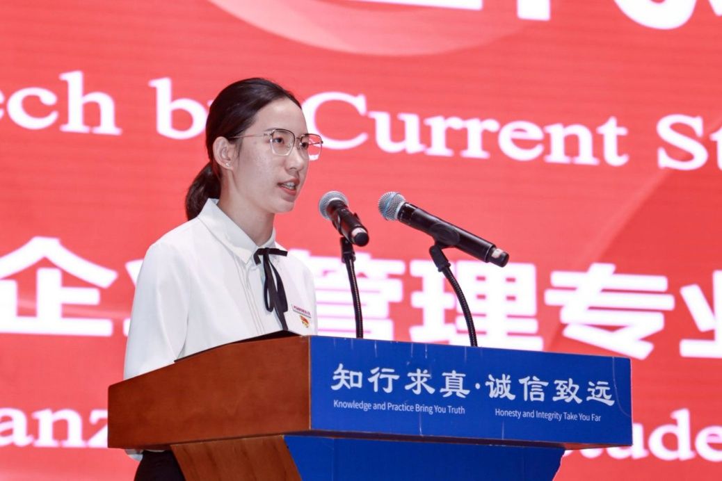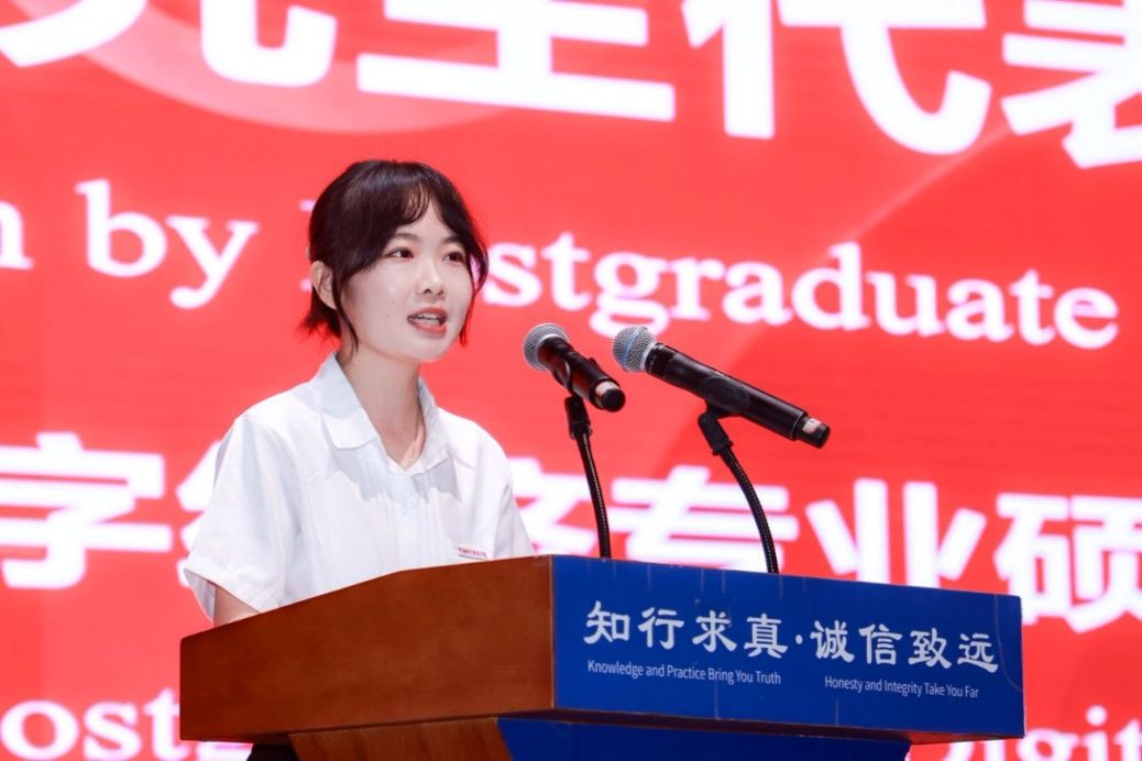 在校生代表、2023级博士研究生黄千芷在中南大求学十年,她不仅见证了学校“双一流”建设迈上新台阶,也见证了学院在“经管法融通的一流商学院”目标引领下凝心聚力,开拓新局。她鼓励全体新生,以笃行不惑之姿、弘毅致远之心,砥砺科研,拥抱变革,开拓眼界,在时代的浪潮中共谱复兴华章。